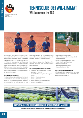 Seit nunmehr über 35 Jahren finden Tennis- freunde jeden Alters in unserer schönen Anlage direkt an der Limmat den idealen Rahmen für ihre Freizeit. Unser Club verfügt über drei Aus- senplätze mit automatischer Sprinkleranlage und Flutlicht. Das Clubhaus ist mit Cheminée, Küche und Garderoben/Duschen ausgerüstet. Nebst dem sportlichen Geschehen bietet der Tennisclub Oetwil nicht zuletzt durch seine fa- miliäre Atmosphäre auch den idealen Rahmen für gemütliche Anlässe.