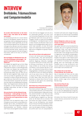 Die Aufgabe hat eigentlich gut auf den Alltag gepasst, aber natürlich ist der Rahmen nor- malerweise ein anderer. Im Geschäft geschieht das Fräsen zum Beispiel fast ausschliesslich maschinell, im Wettbewerb dagegen auch in konventioneller Weise, also von Hand. Als ich 2014 die Lehre begonnen habe, wurde noch recht viel auf diese Art gearbeitet, bei meiner Unterstiftin im dritten Lehrjahr sieht das schon ganz anders aus. Daran sieht man, wie schnell sich der Beruf ändert. Ausserdem war natürlich auch der Zeitdruck am Wettbewerb ein grosser Faktor. Das Programmieren stimmte, das Teil hat gepasst; nur beim Konstruieren hatte ich deswegen etwas Mühe, da habe ich Punkte liegengelassen.