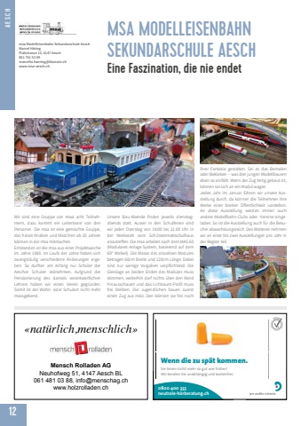 AESCH12Mensch Rolladen AGNeuhofweg 51, 4147 Aesch BL061 481 03 88, info@menschag.chwww.holzrolladen.ch%u00abnat%u00fcrlich,menschlich%u00bbWenn die zu sp%u00e4t kommen.Sie h%u00f6ren nicht mehr so gut wie fr%u00fcher? Wir beraten Sie unabh%u00e4ngig und kostenfrei.0800 400 333neutrale-h%u00f6rberatung.chWenn die zu sp%u00e4t kommen.Sie h%u00f6ren nicht mehr so gut wie fr%u00fcher? Wir beraten Sie unabh%u00e4ngig und kostenfrei.0800 400 333neutrale-h%u00f6rberatung.chWenn die zu sp%u00e4t kommen.Sie h%u00f6ren nicht mehr so gut wie fr%u00fcher? Wir beraten Sie unabh%u00e4ngig und kostenfrei.0800 400 333neutrale-h%u00f6rberatung.chWenn das zu leise ist.Sie h%u00f6ren nicht mehr so gut wie fr%u00fcher? Wir beraten Sie unabh%u00e4ngig und kostenfrei.0800 400 333 neutrale-h%u00f6rberatung.chWenn die zu sp%u00e4t kommen.Sie h%u00f6ren nicht mehr so gut wie fr%u00fcher? Wir beraten Sie unabh%u00e4ngig und kostenfrei.0800 400 333neutrale-h%u00f6rberatung.ch3Wir sind eine Gruppe von etwa acht Teilnehmern, dazu kommt ein Leiterteam von drei Personen. Die msa ist eine gemischte Gruppe, das heisst Knaben und M%u00e4dchen ab 10 Jahren k%u00f6nnen in der msa mitmachen.Entstanden ist die msa aus einer Projektwoche im Jahre 1990. Im Laufe der Jahre haben sich zwangsl%u00e4ufig verschiedene %u00c4nderungen ergeben. So durften am Anfang nur Sch%u00fcler der Aescher Schulen teilnehmen. Aufgrund der Pensionierung des damals verantwortlichen Lehrers haben wir einen Verein gegr%u00fcndet. Somit ist der Wohn- oder Schulort nicht mehr massgebend.Unsere Bau-Abende finden jeweils dienstagabends statt. Ausser in den Schulferien sind wir jeden Dienstag von 19.00 bis 21.00 Uhr in der Werkstatt vom Sch%u00fctzenmattschulhaus anzutreffen. Die msa arbeitet nach dem MAS 60 (Modulares Anlage System, basierend auf dem 60%u00b0 Winkel). Die Masse des einzelnen Modules betragen 60cm Breite und 120cm L%u00e4nge. Dabei sind nur wenige Vorgaben verpflichtend: Die Gleislage an beiden Enden des Modules muss stimmen, weiterhin darf nichts %u00fcber den Rand hinausschauen und das Lichtraum-Profil muss frei bleiben. Die Jugendlichen bauen zuerst einen Zug aus Holz. Den k%u00f6nnen sie frei nach msa Modelleisenbahn Sekundarschule Aesch Marcel H%u00e4ringFluhstrasse 13, 4147 Aesch 061 751 52 69marcello.haering@bluewin.chwww.msa-aesch.chAESCHihrer Fantasie gestalten. Sei es das Bemalen oder Bekleben %u2013 was den jungen Modellbauern eben so einf%u00e4llt. Wenn der Zug fertig gebaut ist, k%u00f6nnen sie sich an ein Modul wagen.Jedes Jahr im Januar f%u00fchren wir unsere Ausstellung durch, da k%u00f6nnen die Teilnehmer ihre Werke einer breiten %u00d6ffentlichkeit vorstellen. An diese Ausstellung werden immer auch andere Modellbahn-Clubs oder -Vereine eingeladen. So ist die Ausstellung auch f%u00fcr die Besucher abwechslungsreich. Des Weiteren nehmen wir an einer bis zwei Ausstellungen pro Jahr in der Region teil. MSA MODELLEISENBAHN SEKUNDARSCHULE AESCH Eine Faszination, die nie endet