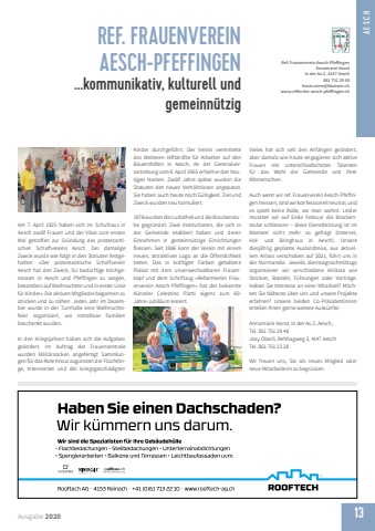 AESCHAusgabe 2020 13REF. FRAUENVEREIN AESCH-PFEFFINGEN...kommunikativ, kulturell und gemeinn%u00fctzigRef. Frauenverein Aesch-Pfeff ingenAnnamarie HoratIn der Au 2, 4147 Aesch061 751 29 48horat.anne@bluewin.chwww.refkirche-aesch-pfeff ingen.chVieles hat sich seit den Anf%u00e4ngen ge%u00e4ndert, aber damals wie heute engagieren sich aktive Frauen mit unterschiedlichsten Talenten f%u00fcr das Wohl der Gemeinde und ihrer Mitmenschen. Auch wenn wir ref. Frauenverein Aesch-Pfeffingen heissen, sind wir konfessionell neutral, und es spielt keine Rolle, wo man wohnt. Leider mussten wir auf Ende Februar die Brockenstube schliessen %u2013 diese Dienstleistung ist im Moment nicht mehr so gefragt (Internet, Hol- und Bringhaus in Aesch). Unsere diesj%u00e4hrig geplante Auslandreise, aus aktuellem Anlass verschoben auf 2021, f%u00fchrt uns in die Normandie. Jeweils dienstagnachmittags organisieren wir verschiedene Anl%u00e4sse wie Stricken, Basteln, F%u00fchrungen oder Vortr%u00e4ge.Haben Sie Interesse an einer Mitarbeit? M%u00f6chten Sie N%u00e4heres %u00fcber uns und unsere Projekte erfahren? Unsere beiden Co-Pr%u00e4sidentinnen erteilen Ihnen gerne weitere Ausk%u00fcnfte:Annamarie Horat, In der Au 2, Aesch, Tel. 061 751 29 48Josy Oberli, Rehhagweg 3, 4147 Aesch Tel. 061 751 23 28Wir freuen uns, Sie als neues Mitglied oder neue Mitarbeiterin zu begr%u00fcssen.Am 7. April 1925 haben sich im Schulhaus in Aesch zw%u00f6lf Frauen und der Vikar zum ersten Mal getroffen zur Gr%u00fcndung des protestantischen Schaffvereins Aesch. Der damalige Zweck wurde wie folgt in den Statuten festgehalten: %u00abDer protestantische Schaffverein Aesch hat den Zweck, f%u00fcr bed%u00fcrftige Kirchgenossen in Aesch und Pfeffingen zu sorgen, besonders auf Weihnachten und in erster Linie f%u00fcr Kinder%u00bb. Die aktiven Mitglieder begannen zu stricken und zu n%u00e4hen. Jedes Jahr im Dezember wurde in der Turnhalle eine Weihnachtsfeier organisiert, wo mittellose Familien beschenkt wurden.In den Kriegsjahren haben sich die Aufgaben ge%u00e4ndert. Im Auftrag der Frauenzentrale wurden Milit%u00e4rsocken angefertigt Sammlungen f%u00fcr das Rote Kreuz zugunsten der Fl%u00fcchtlinge, Internierten und der kriegsgesch%u00e4digten Kinder durchgef%u00fchrt. Der Verein vermittelte des Weiteren Hilfskr%u00e4fte f%u00fcr Arbeiten auf den Bauernh%u00f6fen in Aesch. An der Generalversammlung vom 6. April 1965 erhielt er den heutigen Namen. Zw%u00f6lf Jahre sp%u00e4ter wurden die Statuten den neuen Verh%u00e4ltnissen angepasst. Sie haben auch heute noch G%u00fcltigkeit. Ziel und Zweck wurden neu formuliert.1978 wurden die Ludothek und die Brockenstube gegr%u00fcndet. Zwei Institutionen, die sich in der Gemeinde etabliert haben und deren Einnahmen in gemeinn%u00fctzige Einrichtungen fliessen. Seit 1986 kann der Verein mit einem neuen, attraktiven Logo an die %u00d6ffentlichkeit treten. Das in kr%u00e4ftigen Farben gehaltene Plakat mit dem unverwechselbaren Frauenkopf und dem Schriftzug %u00abReformierter Frauenverein Aesch-Pfeffingen%u00bb hat der bekannte K%u00fcnstler Celestino Piatti eigens zum 60-Jahre-Jubil%u00e4um kreiert.
