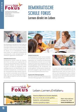 ARLESHEIM16Ausgabe 2019 3 ARLESHEIMDEMOKRATISCHE SCHULE FOKUSLernen direkt im LebenDas p%u00e4dagogische Konzept der FOKUS geht auf die Sudbury Valley School zur%u00fcck, die seit 1968 in Framingham (Massachusetts) erfolgreich t%u00e4tig ist.Inzwischen setzen dieses Konzept weltweit %u00fcber 40 Schulen um. An demokratischen Schulen lernen Kinder und Jugendliche selbstbestimmt und individuell, in einer altersgemischten, demokratisch organisierten Gemeinschaft. Selbstbestimmt lernen Demokratische Schulen nutzen die Tatsache, dass Kinder von Natur aus neugierig sind und sich aus innerem Antrieb heraus in der Welt zurechtfinden m%u00f6chten. Die Schule dient ihnen als Quelle. Sie bietet ein anregendes Umfeld, vielf%u00e4ltiges Material und Mitarbeitende mit verschiedenen Kompetenzen und Interessen. Kinder unterschiedlichen Alters arbeiten miteinander und lernen voneinander. Und die Erfahrung zeigt: Jeder lernt die grundlegenden Dinge in seinem eigenen Rhythmus und auf seine eigene Art und Weise. Gelebte Demokratie An demokratischen Schulen sind die Sch%u00fclerinnen und Sch%u00fcler stark eingebunden in die Schulorganisation und -verwaltung. Die Mitwirkung in den demokratischen Gremien und an der Organisation der Schule sind umfassende Lern- und Entwicklungsfelder. Insbesondere wird damit die Pers%u00f6nlichkeitsbildung der Sch%u00fclerinnen und Sch%u00fcler gef%u00f6rdert. Demokratische Schulen bringen h%u00f6chst engagierte, eigenmotivierte, tolerante und sozial kompetente Menschen hervor. Erg%u00e4nzendes Bildungsangebot Die FOKUS versteht sich als Erg%u00e4nzung zum bestehenden Bildungsangebot. Sie ist besonders f%u00fcr Kinder und Jugendliche geeignet, die ein starkes Bed%u00fcrfnis nach Selbstbestimmung und Mitgestaltung haben. Denn das Leben und Lernen an einer demokratischen Schule erfordert ein hohes Mass an Eigenst%u00e4ndigkeit und die Bereitschaft, f%u00fcr sich und die Gemeinschaft Verantwortung zu %u00fcbernehmen.demokratische Schule FokusMalsmattenweg 3, 4144 Arlesheim061 421 44 64info@schulefokus.chwww.schulefokus.chMehr Informationen erhalten Sie unter www.schulefokus.chGesamte obligatorische Schulzeit abgedecktMo.%u2013Fr. 8%u201317 Uhr, Mi. 8%u201312 Uhr ge%u00f6ffnetFlexible Ein- und AuslaufzeitenAufnahme ganzj%u00e4hrig m%u00f6glichLeben Lernen EntfaltenAusgabe 2019 3ARLESHEIMDEMOKRATISCHE SCHULE FOKUSLernen direkt im LebenDas p%u00e4dagogische Konzept der FOKUS geht auf die Sudbury Valley School zur%u00fcck, die seit 1968 in Framingham (Massachusetts) erfolgreich t%u00e4tig ist.Inzwischen setzen dieses Konzept weltweit %u00fcber 40 Schulen um. An demokratischen Schulen lernen Kinder und Jugendliche selbstbestimmt und individuell, in einer altersgemischten, demokratisch organisierten Gemeinschaft. Selbstbestimmt lernen Demokratische Schulen nutzen die Tatsache, dass Kinder von Natur aus neugierig sind und sich aus innerem Antrieb heraus in der Welt zurechtfinden m%u00f6chten. Die Schule dient ihnen als Quelle. Sie bietet ein anregendes Umfeld, vielf%u00e4ltiges Material und Mitarbeitende mit verschiedenen Kompetenzen und Interessen. Kinder unterschiedlichen Alters arbeiten miteinander und lernen voneinander. Und die Erfahrung zeigt: Jeder lernt die grundlegenden Dinge in seinem eigenen Rhythmus und auf seine eigene Art und Weise. Gelebte Demokratie An demokratischen Schulen sind die Sch%u00fclerinnen und Sch%u00fcler stark eingebunden in die Schulorganisation und -verwaltung. Die Mitwirkung in den demokratischen Gremien und an der Organisation der Schule sind umfassende Lern- und Entwicklungsfelder. Insbesondere wird damit die Pers%u00f6nlichkeitsbildung der Sch%u00fclerinnen und Sch%u00fcler gef%u00f6rdert. Demokratische Schulen bringen h%u00f6chst engagierte, eigenmotivierte, tolerante und sozial kompetente Menschen hervor. Erg%u00e4nzendes Bildungsangebot Die FOKUS versteht sich als Erg%u00e4nzung zum bestehenden Bildungsangebot. Sie ist besonders f%u00fcr Kinder und Jugendliche geeignet, die ein starkes Bed%u00fcrfnis nach Selbstbestimmung und Mitgestaltung haben. Denn das Leben und Lernen an einer demokratischen Schule erfordert ein hohes Mass an Eigenst%u00e4ndigkeit und die Bereitschaft, f%u00fcr sich und die Gemeinschaft Verantwortung zu %u00fcbernehmen.demokratische Schule FokusMalsmattenweg 3, 4144 Arlesheim061 421 44 64info@schulefokus.chwww.schulefokus.chMehr Informationen erhalten Sie unter www.schulefokus.chGesamte obligatorische Schulzeit abgedecktMo.%u2013Fr. 8%u201317 Uhr, Mi. 8%u201312 Uhr ge%u00f6ffnetFlexible Ein- und AuslaufzeitenAufnahme ganzj%u00e4hrig m%u00f6glichLeben Lernen Entfalten