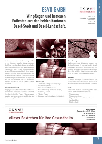 ARLESHEIMAusgabe 2020 17Wir bieten eine professionelle Betreuung und Pflege von Menschen aus allen Altersgruppen an, die infolge von Alter, Behinderung, Unfall oder Krankheit vor%u00fcbergehend oder dauerhaft beeintr%u00e4chtigt sind. Durch unsere langj%u00e4hrige Erfahrung im Pflegebereich und dank einem ausgebildeten Team von Fachkr%u00e4ften k%u00f6nnen wir eine gezielte und ganzheitliche Unterst%u00fctzung Ihrer Angeh%u00f6rigen gew%u00e4hrleisten. Falls Sie Fragen haben und ein pers%u00f6nliches Gespr%u00e4ch vereinbaren m%u00f6chten, dann freuen wir uns auf Ihre Kontaktaufnahme.Unser EinsatzbereichWir pflegen und betreuen Patienten aus den beiden Kantonen Basel-Stadt und Basel-Landschaft.Eine kontinuierliche Pflege, Pr%u00e4senz sowohl tags%u00fcber als auch nachts sowie Eins%u00e4tze am Wochenende geh%u00f6ren f%u00fcr uns dazu.Leistungen%u2022 Ganzheitliche Pflege und Betreuung in vertrauter Umgebung%u2022 Beratung und Unterst%u00fctzung%u2022 Wundbehandlung, Blutzucker messen, Infusionen, Spritzen%u2022 Palliative Pflege%u2022 Betreuung und Unterst%u00fctzung im HaushaltFinanzierung%u00c4rztlich verordnete Leistungen werden von der Krankenkasse, IV oder UV bezahlt, da wir Mitglied der Spitex priv%u00e9e Suisse sind. Nicht verordnete Leistungen m%u00fcssen selbst bezahlt werden, eine allf%u00e4llige Zusatzversicherung wird Ihnen die Kosten teilweise zur%u00fcckerstatten.NetzwerkEs besteht eine enge Zusammenarbeit mit der spitalexternen Onkologie-Pflege, mit Haus%u00e4rzten, Heimen, Spit%u00e4lern und mit dem Sozialamt.TeamUnser Team setzt sich aus den folgenden Fachkr%u00e4ften und Mitarbeitern zusammen:%u2022 Pflegefachfrauen%u2022 PflegeassistentInnen%u2022 PflegehelferInnen mit SRK-Grundkurs%u2022 Haushaltshilfen%u2022 Sch%u00fclerin FAGEESVO GMBHWir pflegen und betreuen Patienten aus den beiden Kantonen Basel-Stadt und Basel-Landschaft.ESVO GmbHRauacherstr. 24, 4125 Riehen061 481 09 53info@esvo.chwww.esvo.chARLESHEIMESVO GmbHRauacherstr. 24, 4125 RiehenTel. 061 481 09 53 Mobil 079 262 23 19www.esvo.ch %u00abUnser Bestreben f%u00fcr Ihre Gesundheit%u00bb info@esvo.chESVO GmbHRauacherstr. 24, 4125 RiehenTel. 061 481 09 53 Mobil 079 262 23 19www.esvo.ch %u00abUnser Bestreben f%u00fcr Ihre Gesundheit%u00bb info@esvo.ch