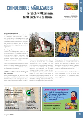 ARLESHEIMAusgabe Ausgabe 2019 2020 319 ARLESHEIMCHINDERHUUS M%u00c4RLIZAUBERHerzlich willkommen, f%u00fchlt Euch wie zu Hause!Unser BetreuungsangebotDas Chinderhuus M%u00e4rlizauber betreut Kinder in einer m%u00f6glichst familien%u00e4hnlichen Situation. Das Angebot ist eine Erg%u00e4nzung zur Schule und zum Elternhaus. Wir betreuen Kinder im Alter von drei Monaten bis zum neunten Lebensjahr. Das Chinder-huus verf%u00fcgt %u00fcber 26 Ganztagespl%u00e4tze und einen Tageskindergarten mit 24 Tagespl%u00e4tzen.Unser LeitgedankeAlle Kinder haben die gleichen Rechte und sind mit derselben W%u00fcrde zu behandeln. Die Gleichberechtigung von M%u00e4dchen und Jungen und von Kindern mit verschiedener kultureller und nationaler Herkunft oder unterschiedlichen F%u00e4higkeiten ist f%u00fcr uns sehr wichtig. Indem wir jedes Kind mit seinem individuellen K%u00f6nnen und seinen Bed%u00fcrfnissen ernst nehmen, kann es in seiner Pers%u00f6nlichkeit wachsen und Selbstvertrauen gewinnen.Spiel, Natur und Kreativit%u00e4t im Einklang mit den Jahreszeiten Durch intensives Erleben der Natur und des Jahreslaufes entwickeln Kinder sowohl ihre Wahrnehmung wie auch ihre kognitiven F%u00e4higkeiten. Unsere rhythmischen Abl%u00e4ufe im Tages-, Wochen- und Jahreslauf geben dem Kind Orientierung in Raum und Zeit. Sie vermitteln Sicherheit und %u00dcberschaubarkeit. Das Spiel und das T%u00e4tigsein im Innenraum, im Garten und im Wald bieten ein vielf%u00e4ltiges %u00dcbungsfeld f%u00fcr motorische Geschicklichkeit, die Sinnesentwicklung und die Ausdauer. Unsere k%u00fcnstlerischen T%u00e4tigkeiten wie Musik, Malen und Werken f%u00f6rdern das Kind in seinem ganzen Wesen. Die Kinder werden in allt%u00e4gliche T%u00e4tigkeiten wie Backen, Kneten, Werken, Wischen etc. einbezogen und so dazu ermutigt, ihre eigenen Erfahrungen zu machen. Die Puppenspiele, Geschichten und Reigen sprechen die Fantasie und die Gem%u00fctsebene des Kindes an. Durch die gemeinsame Erziehung und Betreuung von Kindern unterschiedlichen Alters wachsen soziale F%u00e4higkeiten wie Toleranz, R%u00fccksichtnahme, Hilfsbereitschaft und gegenseitiges Unterst%u00fctzen. F%u00fcr weitere Informationen oder f%u00fcr eine Besichtigung kontaktieren Sie uns. Wir freuen uns, Ihnen einen Einblick ins Chinderhuus M%u00e4rlizauber zu geben.Chinderhuus M%u00e4rlizauberSandra LocherBaselstrasse 54, 4144 Arlesheim061 599 89 00, 077 439 01 81info@chinderhuus-maerlizauber.chChinderhuus M%u00e4rlizauberHalb- & GanztagesbetreuungMittagstisch & AbholdienstTageskindergartenNachmittagsbetreuungSpielgruppechinderhuus-maerlizauber.chinfo@chinderhuus-maerlizauber.ch T 061 599 89 00 | M 077 439 01 81Baselstrasse 54 | 4144 Arlesheim93x60mm_Inserat_Vereinsinfo_Birsig_Dorneck_18.indd 1 22.04.18 19:12Ausgabe 2019 CHINDERHUUS M%u00c4RLIZAHerzlich willkof%u00fchlt Euch wie zu Unser BetreuungsangebotDas Chinderhuus M%u00e4rlizauber betreut Kinder in einer m%u00f6glichst familien%u00e4hnlichen Situation. Das Angebot ist eine Erg%u00e4nzung zur Schule und zum Elternhaus. Wir betreuen Kinder im Alter von drei Monaten bis zum neunten Lebensjahr. Das Chinder-huus verf%u00fcgt %u00fcber 26 Ganztagespl%u00e4tze und einen Tageskindergarten mit 24 Tagespl%u00e4tzen.Unser LeitgedankeAlle Kinder haben die gleichen Rechte und sind mit derselben W%u00fcrde zu behandeln. Die Gleichberechtigung von M%u00e4dchen und Jungen und von Kindern mit verschiedener kultureller und nationaler Herkunft oder unterschiedlichen F%u00e4higkeiten ist f%u00fcr uns sehr wichtig. Indem wir jedes Kind mit seinem individuellen K%u00f6nnen und seinen Bed%u00fcrfnissen ernst nehmen, kann es in seiner Pers%u00f6nlichkeit wachsen und Selbstvertrauen gewinnen.Spiel, Natur und Kreativit%u00e4t im Einklang mit den Jahreszeiten Durch intensives Erleben der Natur und des Jahreslaufes entwickeln Kinder sowohl ihre Wahrnehmung wie auch ihre kognitiven F%u00e4higkeiten. Unsere rhythmischen Abl%u00e4ufe im Tages-, Wochen- und Jahreslauf gebeentierung in Raum und ZeiSicherheit und %u00dcberschaubaund das T%u00e4tigsein im Innenrauim Wald bieten ein vielf%u00e4ltigemotorische Geschicklichkeit,wicklung und die Ausdauer. schen T%u00e4tigkeiten wie Musik, Mf%u00f6rdern das Kind in seinem gaKinder werden in allt%u00e4gliche T%u00e4cken, Kneten, Werken, Wischeund so dazu ermutigt, ihre eigezu machen. Die Puppenspiele,Chinderhuus M%u00e4rlizauberHalb- & GanztagesbetreuungMittagstisch & AbholdienstTageskindergartenNachmittagsbetreuungSpielgruppechinderhuus-maerlizauber.chinfo@chinderhuus-maerlizauber.ch T 061 599 89 00 | M 077 439 01 81Baselstrasse 54 | 4144 Arlesheim93x60mm_Inserat_Vereinsinfo_Birsig_Dorneck_18.indd 1 22.04.18 19:12Angebot:Augenkontrolle %u2013 3D Sehtest, Kontaktlinsen, F%u00fchrerscheinSehtest, Kinder brillen, Brillenservice, HomeserviceStandort am Bahnhof Standort im DorfSichtArt Optik Bahnhof SichtArt Optik DorfBahnhofstrasse 14 Hauptstrasse 344144 Arlesheim 4144 ArlesheimTel. 061 703 02 02 Tel. 061 701 80 00bahnhof@sichtart-optik.ch dorf@sichtart-optik.ch