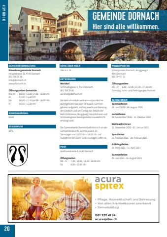 DORNACH20GEMEINDE DORNACHHier sind alle willkommen.DORNACHGEMEINDEVERWALTUNGEinwohnergemeinde DornachHauptstrasse 33, 4143 Dornach061 706 25 00info@dornach.chwww.dornach.ch%u00d6ffnungszeiten GemeindeMo, Mi 08.30 %u2013 11.30 | 14.00 %u2013 16.00 UhrDi 07.30 %u2013 11.30 UhrDo 08.30 %u2013 11.30 | 14.00 %u2013 18.00 UhrFr 08.30 %u2013 11.30 UhrEINWOHNERZAHL6 848 STEUERFUSS88 %H%u00d6HE %u00dcBER MEER338 m %u00fc. M.ENTSORGUNGWerkhofSchmiedegasse 4, 4143 Dornach061 706 25 80werkhof@dornach.chDie Kehrichtabfuhr wird einmal pro Woche durchgef%u00fchrt. Das Dorf ist in zwei Sammelgebiete aufgeteilt, sodass jeweils am Dienstag der westlich und am Freitag der %u00f6stlich derBahnhofstrasse / Bruggweg / Hauptstrasse und Schmiedegasse bereitgestellte Hauskehricht entsorgt wird.Die Sammelstelle Ramstel befindet sich an derGempenstrasse 48, welche jeweils an Samstagen von 10.00 Uhr %u2013 16.00 Uhr, mit Ausnahme von Sonn- und Feiertagen, offen ist.POSTAmthausstrasse 6, 4143 Dornach%u00d6ffungszeitenMo %u2013 Fr 7.30 %u2013 12.00 / 13.30 %u2013 18.00 UhrSa 8.00 %u2013 12.00 UhrPOLIZEIPOSTENPolizeiposten Dornach, Bruggweg 44143 Dornach 061 704 71 11 %u00d6ffnungszeitenMo %u2013 Fr 8.00 %u2013 12.00 / 13.30 %u2013 17.30 UhrSamstag, Sonn- und Feiertage geschlossenSCHULFERIENSommerferien29. Juni 2020 %u2013 09. August 2020Herbstferien28. September 2020 %u2013 11. Oktober 2020Weihnachtsferien21. Dezember 2020 %u2013 03. Januar 2021Sportferien15. Februar 2021 %u2013 28. Februar 2021Fr%u00fchlingsferien29. M%u00e4rz 2021 %u2013 11. April 2021Sommerferien05. Juli 2021 %u2013 15. August 2021%u2022 Pflege, Hauswirtschaft und Betreuung%u2022 Von allen Krankenkassen anerkannt%u2022 Gemeinn%u00fctzig061 322 41 74acuraspitex.ch