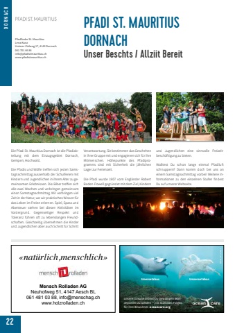 DORNACH22DORNACHPFADI ST. MAURITIUS DORNACH Unser Beschts / Allziit Bereit Pfadfinder St. MauritiusLena KunzUnterer Zielweg 17, 4143 Dornach061 701 66 86info@pfadistmauritius.chwww.pfadistmauritius.chund Jugendlichen eine sinnvolle Freizeitbesch%u00e4ftigung zu bieten. Wolltest Du schon lange einmal Pfadiluft schnuppern? Dann komm doch bei uns an einem Samstagnachmittag vorbei! Weitere Informationen zu den einzelnen Stufen findest Du auf unserer Webseite.Die Pfadi St. Mauritius Dornach ist die Pfadiabteilung mit dem Einzugsgebiet Dornach, Gempen, Hochwald.Die Pfadis und W%u00f6lfe treffen sich jeden Samstagnachmittag ausserhalb der Schulferien mit Kindern und Jugendlichen in ihrem Alter zu gemeinsamen Erlebnissen. Die Biber treffen sich alle zwei Wochen und verbringen gemeinsam einen Samstagnachmittag. Wir verbringen viel Zeit in der Natur, wo wir praktisches Wissen f%u00fcr das Leben im Freien erlernen. Spiel, Spass und Abenteuer stehen bei diesen Aktivit%u00e4ten im Vordergrund. Gegenseitiger Respekt und Toleranz f%u00fchren oft zu lebenslangen Freundschaften. Gleichzeitig %u00fcbernehmen die Kinder und Jugendlichen aber auch Schritt f%u00fcr Schritt Verantwortung. Sie bestimmen das Geschehen in ihrer Gruppe mit und engagieren sich f%u00fcr ihre Mitmenschen. H%u00f6hepunkte des Pfadiprogramms sind mit Sicherheit die j%u00e4hrlichen Lager zur Ferienzeit. Die Pfadi wurde 1907 vom Engl%u00e4nder Robert Baden-Powell gegr%u00fcndet mit dem Ziel, Kindern Mensch Rolladen AGNeuhofweg 51, 4147 Aesch BL061 481 03 88, info@menschag.chwww.holzrolladen.ch%u00abnat%u00fcrlich,menschlich%u00bbUnsere Ozeane drohen zu gewaltigen M%u00fclldeponien zu werden %u2013 mit t%u00f6dlichen Folgen f%u00fcr ihre Bewohner. oceancare.orgSPINAS CIVIL VOICESUnersetzbar. Unzersetzbar.