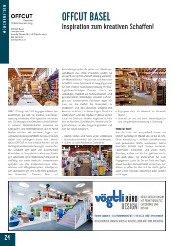 24M%u00dcNCHENSTEIN M%u00dcNCHENSTEINOFFCUT BASEL OFFCUT Basel Inspiration zum kreativen Schaffen! Dreispitz ArealVenedig-Strasse 30, 4142 M%u00fcnchenstein061 331 06 36basel@off cut.ch%u2022 Engagiere dich als Benevol im Materialmarkt.%u2022 Unterst%u00fctze uns mit einer Materialspende und bring Wiederverwertung in Schwung.Material-Treff Hast Du Lust, mit anzupacken? Immer am letzten Samstag im Monat von 10 bis 16 Uhr. Ohne Anmeldung %u2013 einfach vorbeikommen und gemeinsam Stoffe ausmessen, Garne b%u00fcscheln, Kn%u00f6pfe nach Farben sortieren, Fadenrollen einr%u00e4umen und vieles mehr. Plaudern, Kaffee und Kuchen geh%u00f6ren nat%u00fcrlich auch dazu. Als Dankesch%u00f6n f%u00fcr Dein Engagement darfst Du Dir am Ende des Tages etwas aus dem Materialmarkt aussuchen. Der Anlass ist offen f%u00fcr alle und Du darfst gerne auch Deine Freunde, Bekannten oder Familie mitbringen.OFFCUT bringt seit 2013 engagierte Menschen zusammen, die sich f%u00fcr kreative Materialverwertung einsetzen, Gleichgesinnte vernetzen und f%u00fcr %u00f6kologisches Gestalten sensibilisieren. In unseren Materialm%u00e4rkten sammeln wir Gebraucht- und Restmaterialien, die im Abfall landen w%u00fcrden. Wir sortieren, lagern und verkaufen diese als Rohstoffe f%u00fcr neue Projekte weiter und verl%u00e4ngern damit ihre Lebensdauer. OFFCUT ist eine kreative Antwort auf die %u00f6kologischen Herausforderungen unserer Zeit. Wir sch%u00e4tzen den Wert von bestehenden Materialien und inspirieren zu einem nachhaltigen Lebensstil. Unser Materialsortiment ist so vielf%u00e4ltig wie seine Herkunft: Unternehmen spenden uns ihre Produktionsreste, %u00dcbersch%u00fcsse und M%u00e4ngelexemplare. Privatpersonen %u00fcberlassen uns ihre nicht mehr gebrauchten Materialien. Theater-, Film- und Ausstellungsmachende geben uns Wiederverwendbares aus ihren Projekten weiter. So entsteht ein reicher und sich st%u00e4ndig wandelnder Materialfundus %u2013 Inspiration zum kreativen Schaffen! Unser Sortiment ist Ausgangspunkt f%u00fcr eine kreative Auseinandersetzung mit %u00f6kologisch-nachhaltigen Themen. Durch ein vielf%u00e4ltiges Angebot an handwerklichen und gestalterischen Workshops, privaten F%u00fchrungen und kollaborativen Formaten regen wir dazu an, die Vielfalt der Materialien zu entdecken und den aktuellen Umgang mit Ressourcen kritisch zu hinterfragen. Sinnliche Erfahrungen und der kreative Prozess stehen dabei im Zentrum. Unsere Angebote richten sich an Familien, Schulklassen, Vereine und Organisationen %u2013 an alle, die gerne gestalten und sich auf Neues einlassen.%u2022 Komm vorbei und nutze unser vielseitiges Materialsortiment f%u00fcr dein n%u00e4chstes Projekt.%u2022 St%u00e4rke uns den R%u00fccken als G%u00f6nner/in.