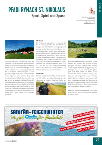 Ausgabe 2020 29Sanit%u00e4r + HeizungEXPRESS-Kundenservicewww.sanitaer-feigenwinter.ch061 711 99 04PFADI RYNACH ST. NIKOLAUS REINACHSport, Spiel und Spass Pfadi Rynach St. NikolausEstelle FavrodIm Reinacherhof 249, 4153 Reinachinfo@pfadirynach.chwww.pfadirynach.cheinem verr%u00fcckten Professor bei seinen Experimenten, ein anderes Mal m%u00fcssen wir eine gefangene Prinzessin befreien. Dabei arbeiten wir als Gruppe und helfen uns gegenseitig. Das Wichtigste ist, dass wir unser Bestes geben, ganz nach dem Motto der W%u00f6lfli: %u201eEuses Bescht!%u201c Wir lernen die Natur kennen, sind draussen unterwegs, finden neue Freunde, spielen, lachen, entdecken und werden vielleicht ein wenig schmutzig. Das Wichtigste ist aber immer, dass es Spass macht. Ziel ist es, die Welt mit all unseren Sinnen zu entdecken und immer wieder Neues zu erleben.Haben wir Dein Interesse geweckt? Dann melde Dich bei uns und schau mal vorbei. Wir freuen uns auf Dich!Ob warm oder kalt, trocken oder nass, wir Pfadfinder sind allzeit bereit. Immer samstags treffen wir uns und verbringen den Nachmittag miteinander. An diesen Nachmittagen erwartet die Teilnehmer ein vielseitiges Programm mit so manchen %u00dcberraschungen. Es wird gespielt und gebastelt, und auch die eine oder andere Figur aus einer anderen Welt bittet manchmal bei den Pfadfindern um Hilfe. Und was tun wir so als gute Pfadfinder? Nat%u00fcrlich helfen wir und l%u00f6sen gemeinsam das Problem. Nicht zu vergessen: Unser j%u00e4hrliches Highlight, das Sommerlager, das in den Schulferien stattfindet. Die Pfadfinder schlagen sich draussen in den Zelten durch und die kleineren W%u00f6lfli in einem Haus. Spiel, Spass und Lerneffekt garantiert!PfadistufeDie Kinder und Jugendlichen, im Alter von 11 bis 16 Jahren, gestalten die Aktivit%u00e4ten der Gruppe aktiv mit und erleben einzigartige und unvergessliche Abenteuer. Innerhalb der kleinen Gruppen kann jede/r schon fr%u00fch Verantwortung %u00fcbernehmen. Die Aktivit%u00e4ten der Pfadi finden immer unter einem Thema statt (z.B. Indianer, Piraten, Weltreise etc.) und gehen von Handwerk %u00fcber Theater, Pfaditechnik, Spiel und Sport bis zu bewussten Gemeinschaftserlebnissen und ruhigen Momenten. Hast auch Du Lust, mit uns am Samstag Nachmittag Erlebnisse zu bestreiten? Dann findest Du die n%u00e4chste Aktivit%u00e4t auf unserer Webseite.W%u00f6lflistufeM%u00e4dchen und Knaben im Alter von 6 bis 11 Jahren. Wir treffen uns jeden Samstag, um ein Abenteuer zu erleben. Manchmal helfen wir