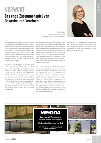 Ausgabe 2020 Vorwort 3061 717 99 11 %u2022 info@meydra.chWir beraten Sie gerne vor Ort!Tor- und Zaunbau97 Jahre Qualit%u00e4t und Erfahrungwww.meydra.chVORWORT VORWORTDas enge Zusammenspiel vonGewerbe und VereinenDebbie GilgenPr%u00e4sidentin Pumptrack MuttenzMitarbeiterin Schwimmverein beider BaselWas w%u00e4ren wir ohne unsere Vereine und ohne all die ehrenamtlichen Helferinnen und Helfer, die sich Tag f%u00fcr Tag und zu jeder Jahreszeit f%u00fcr ihren Sport einsetzen? Meine Eltern waren und sind immer noch f%u00fcr den Schwimmverein beider Basel t%u00e4tig, und ich weiss noch, wie ich als kleines M%u00e4dchen mit ihnen zusammen an den Schwimmwettk%u00e4mpfen am Beckenrand gestanden bin und geholfen habe, wo es als Siebenj%u00e4hrige nur ging. Das ist mir bis heute geblieben; ich setze mich noch nach %u00fcber 30 Jahren daf%u00fcr ein, dass Kinder und Jugendliche ihren Sport aus%u00fcben k%u00f6nnen und daf%u00fcr optimale Bedingungen vorfinden. Obwohl sich Basel als %u00abSportstadt%u00bb r%u00fchmt und auch die umliegenden Gemeinden und Regionen in ihren Werten die Wichtigkeit des Sports und der Bewegung anbringen, wird es f%u00fcr die Vereine immer schwieriger, zu %u00fcberleben oder f%u00fcr ihre Mitglieder gute Trainingsbedingungen zu schaffen. Gelder werden gek%u00fcrzt, Sportst%u00e4tten dicht gemacht und nur wenig neue gebaut. So k%u00e4mpfen wir auch nach %u00fcber rund 80 Jahren immer noch f%u00fcr ein 50-Meter-Hallenbad in der Region. Auch kleinere Projekte, wie beispielsweise die Realisation eines Pumptracks in der Gemeinde Muttenz, stehen vor grossen finanziellen H%u00fcrden. Die Firmen und Gesch%u00e4fte in der Region werden f%u00fcr die Vereine immer unersetzlicher, sind sie es doch schlussendlich, die mit ihren Sponsoringbeitr%u00e4gen Anl%u00e4sse zum Laufen bringen, Projekte mitfinanzieren und ganze Vereine unterst%u00fctzen. Das heisst allerdings im Umkehrschluss, dass Vereine sich mehr pr%u00e4sentieren und in ihrer Kommunikation herausstechen m%u00fcssen. Nicht alle haben dieses Know-how oder k%u00f6nnen es sich leisten, eine Stelle f%u00fcr Kommunikation zu schaffen. Erneut sind diese dann wieder auf die Arbeit von Ehrenamtlichen angewiesen. Es w%u00e4re doch sch%u00f6n, w%u00fcrden das Gewerbe und die Vereine noch enger zusammenarbeiten, sich gegenseitig unterst%u00fctzen und Kooperationen schaffen, damit das Vereinsleben in der Region so vielf%u00e4ltig und innovativ bleibt, wie es sich momentan pr%u00e4sentiert. Damit wir auch f%u00fcr unsere Kinder und Enkelkinder Erinnerungen schaffen k%u00f6nnen, die ihnen ein Leben lang bleiben, und samit sich die ehrenamtliche Arbeit aller Personen auch objektiv betrachtet auszahlt.