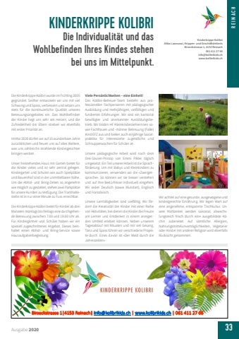 Ausgabe 2020 33KINDERKRIPPE KOLIBRI REINACHDie Individualit%u00e4t und das Wohlbefinden Ihres Kindes stehen bei uns im Mittelpunkt.Die Kinderkrippe Kolibri wurde im Fr%u00fchling 2005 gegr%u00fcndet. Seither entwickeln wir uns mit viel Schwung und Spass, verbessern und setzen uns stets f%u00fcr die kontinuierliche Qualit%u00e4t unseres Betreuungsangebotes ein. Das Wohlbefinden der Kinder liegt uns sehr am Herzen, und die Zufriedenheit der Eltern streben wir ebenfalls mit erster Priorit%u00e4t an. Im Mai 2020 d%u00fcrfen wir auf 15 wunderbare Jahre zur%u00fcckblicken und freuen uns auf alles Weitere, was uns zahlreiche strahlende Kindergesichter bringen werden.Unser freistehendes Haus mit Garten bietet f%u00fcr die Kinder vieles und ist sehr zentral gelegen. Kindergarten und Schulen wie auch Spielpl%u00e4tze und Bauernhof sind in der unmittelbaren N%u00e4he. Um die Abhol- und Bring-Zeiten so angenehm wie m%u00f6glich zu gestalten, stehen zwei Parkpl%u00e4tze f%u00fcr unsere Kunden zu Verf%u00fcgung. Die Tramhaltestelle ist in nur einer Minute zu Fuss erreichbar.Die Kinderkrippe Kolibri bietet f%u00fcr Kinder ab drei Monaten montags bis freitags eine durchgehende Betreuung zwischen 7.00 und 19.00 Uhr an. F%u00fcr Kinderg%u00e4rtner und Sch%u00fcler haben wir ein speziell zugeschnittenes Angebot. Dieses beinhaltet einen Abhol- und Bring-Service sowie Hausaufgabenbegleitung.Viele Pers%u00f6nlichkeiten %u2013 eine Einheit!Das Kolibri-Betreuer-Team besteht aus professionellen Fachpersonen mit p%u00e4dagogischer Ausbildung und mehrj%u00e4hrigen, vielf%u00e4ltigen und fundierten Erfahrungen. Wir sind ein kantonal bewilligter und anerkannter Ausbildungsbetrieb. Wir bilden HF Kleinkinderzieherinnen sowie Fachfrauen und -m%u00e4nner Betreuung (FaBe) Kind EFZ aus und bieten auch einj%u00e4hrige Sozialpraktika f%u00fcr interessierte Jugendliche und Schnupperwochen f%u00fcr Sch%u00fcler an.Unsere p%u00e4dagogische Arbeit wird nach dem Drei-S%u00e4ulen-Prinzip von Emmi Pikler t%u00e4glich umgesetzt. Ein Teil unserer Arbeit ist die Sprachf%u00f6rderung. Um mit Babys und Kleinkindern zu kommunizieren, verwenden wir die %u00abZwergensprache%u00bb. So k%u00f6nnen wir sie besser verstehen und auf ihre Bed%u00fcrfnisse individuell eingehen. Wir reden Deutsch (sowie Mundart), Englisch und Franz%u00f6sisch.Unsere Lernt%u00e4tigkeiten sind vielf%u00e4ltig. Wir f%u00f6rdern die Kreativit%u00e4t der Kinder mit einer Reihe von Aktivit%u00e4ten, bei denen die Kinder die Freude am Lernen und Entdecken in einem anregenden Umfeld erleben k%u00f6nnen. Neben unserem Tagesablauf mit Ritualen und mit viel Gesang, Tanz und Spass f%u00fchren wir verschiedene Projekte durch. Eines davon ist %u00abDer Wald durch die Jahreszeiten%u00bb.Kinderkrippe KolibriAtika Laaroussi, Krippen- und Gesch%u00e4ft sleiterinBirseckstrasse 1, 4153 Reinach061 411 27 66info@kolibrikids.chwww.kolibrikids.chREINACHWir achten auf eine gesunde, ausgewogene und kindergerechte Ern%u00e4hrung. Wir legen Wert auf eine angenehme, entspannte Tischkultur. Unsere Mahlzeiten werden saisonal, abwechslungsreich frisch durch eine ausgebildete K%u00f6chin zubereitet. Auf s%u00e4mtliche Allergien, Nahrungsmittelunvertr%u00e4glichkeiten, Vegetarier oder Kinder mit anderer Religion wird ebenfalls R%u00fccksicht genommen.Birseckstrasse 1|4153 Reinach| info@kolibrikids.ch | www.kolibrikids.ch | 061 411 27 66KINDERKRIPPE KOLIBRI Die Individualit%u00e4t und das Wohlbefinden Ihres Kindes stehen bei uns im Mittelpunkt.Die Kinderkrippe Kolibri wurde im Fr%u00fchling 2005 gegr%u00fcndet. Seither entwickeln wir uns mit viel Schwung und Spass, verbessern und setzen uns stets f%u00fcr die kontinuierliche Qualit%u00e4t unseres Betreuungsangebotes ein. Das Wohlbefinden der Kinder liegt uns sehr am Herzen, und die Zufriedenheit der Eltern streben wir ebenfalls mit erster Priorit%u00e4t an. Im Mai 2020 d%u00fcrfen wir auf 15 wunderbare Jahre zur%u00fcckblicken und freuen uns auf alles Weitere, was uns zahlreiche strahlende Kindergesichter bringen werden.Unser freistehendes Haus mit Garten bietet f%u00fcr die Kinder vieles und ist sehr zentral gelegen. Kindergarten und Schulen wie auch Spielpl%u00e4tze und Bauernhof sind in der unmittelbaren N%u00e4he. Um die Abhol- und Bring-Zeiten so angenehm wie m%u00f6glich zu gestalten, stehen zwei Parkpl%u00e4tze f%u00fcr unsere Kunden zu Verf%u00fcgung. Die Tramhaltestelle ist in nur einer Minute zu Fuss erreichbar.Die Kinderkrippe Kolibri bietet f%u00fcr Kinder ab drei Monaten montags bis freitags eine durchgehende Betreuung zwischen 7.00 und 19.00 Uhr an. F%u00fcr Kinderg%u00e4rtner und Sch%u00fcler haben wir ein speziell zugeschnittenes Angebot. Dieses beinhaltet einen Abhol- und Bring-Service sowie Hausaufgabenbegleitung.Viele Pers%u00f6nlichkeiten %u2013 eine Einheit!Das Kolibri-Betreuer-Team besteht aus professionellen Fachpersonen mit p%u00e4dagogischer Ausbildung und mehrj%u00e4hrigen, vielf%u00e4ltigen und fundierten Erfahrungen. Wir sind ein kantonal bewilligter und anerkannter Ausbildungsbetrieb. Wir bilden HF Kleinkinderzieherinnen sowie Fachfrauen und -m%u00e4nner Betreuung (FaBe) Kind EFZ aus und bieten auch einj%u00e4hrige Sozialpraktika f%u00fcr interessierte Jugendliche und Schnupperwochen f%u00fcr Sch%u00fcler an.Unsere p%u00e4dagogische Arbeit wird nach dem Drei-S%u00e4ulen-Prinzip von Emmi Pikler t%u00e4glich umgesetzt. Ein Teil unserer Arbeit ist die Sprachf%u00f6rderung. Um mit Babys und Kleinkindern zu kommunizieren, verwenden wir die %u00abZwergensprache%u00bb. So k%u00f6nnen wir sie besser verstehen und auf ihre Bed%u00fcrfnisse individuell eingehen. Wir reden Deutsch (sowie Mundart), Englisch und Franz%u00f6sisch.Unsere Lernt%u00e4tigkeiten sind vielf%u00e4ltig. Wir f%u00f6rdern die Kreativit%u00e4t der Kinder mit einer Reihe von Aktivit%u00e4ten, bei denen die Kinder die Freude am Lernen und Entdecken in einem anregenden Umfeld erleben k%u00f6nnen. Neben unserem Tagesablauf mit Ritualen und mit viel Gesang, Tanz un
