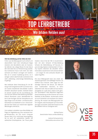Ausgabe 2020 Top Lehrbetriebe 35VSE-Berufsbildung auf der H%u00f6he der ZeitFr%u00fcher war die Bildungswelt noch einfach und %u00fcbersichtlich. Nach dem Schulbesuch folgte meistens eine Berufslehre oder ein Studium. Sie lieferten das n%u00f6tige Wissen f%u00fcr den Beruf, den man dann bis zur Pensionierung aus%u00fcbte. Das funktioniert heute nicht mehr. Die Halbwertszeit von Wissen verringert sich laufend. Was wir in unserer Ausbildung lernen, ist in wenigen Jahren %u00fcberholt oder zumindest nicht mehr vollst%u00e4ndig. Lebenslange Weiterbildung ist gefragt. Was bedeutet diese Entwicklung f%u00fcr die Bildung in der Energiewirtschaft? Zum einen m%u00fcssen bereits bestehende Berufsbilder laufend inhaltlich aktualisiert werden. Deshalb treiben wir derzeit sowohl bei der Grundbildung als auch bei der H%u00f6heren Berufsbildung Netzelektriker/in Revisionen voran. Netzelektriker haben in der heutigen Zeit der Smartphones und Apps l%u00e4ngst auch mit Daten- und Kommunikationsnetzen aus Glasfasern zu tun. Und sie werden bei ihrer Arbeit von modernsten digitalen Werkzeugen unterst%u00fctzt.Zum anderen entstehen neue Berufsbilder als Folge der Digitalisierung. Eine vernetzte Energie-Infrastruktur, die sich durch Computer steuern l%u00e4sst, ist ja nicht bloss leistungsf%u00e4hig. Sie ist auch ein verletzliches System mitzahlreichen Eintrittspforten. Der Traum jedes Hackers. Darum hat der VSE in Zusammenarbeit mit dem Verband ICT-Berufsbildung Schweiz die Weiterbildung %u00abICT-Security Expert mit eidg. Diplom%u00bb mitentwickelt. ICT Security Experts erkennen die aktuellen Sicherheitsrisiken, koordinieren Schutzmassnahmen %u2013 und sorgen f%u00fcr eine wirksame Abwehr von Cyber-Angriffen.Die neue Bildungswelt kann das Leben abwechslungsreicher und vielf%u00e4ltiger machen, sie er%u00f6ffnet neue Chancen. Denn sogar ein vollst%u00e4ndiger Wechsel des Berufs, der Abbrucheiner traditionellen %u00abKarriere%u00bb, ist keineSeltenheit mehr. Warum sollte sich das Interessensgebiet im Laufe eines Lebens nicht g%u00e4nzlich verschieben? Viele Menschen begr%u00fcssen diese Entwicklung und die Chancen der neuen Mobilit%u00e4t im Berufsleben. Andererseits nimmt sie auch Sicherheit und erschwert die Lebensplanung. Wir m%u00fcssen das Bildungssystem daher sorgsam, aber konsequent auf neue Anforderungen ausrichten. Damit die Strasse durchs Berufsleben nicht zur Sackgasse wird.Michael PaulusBereichsleiter Netze und BerufsbildungVerband SchweizerischerElektrizit%u00e4tsunternehmen VSE%u00a9fotolia.comTOP LEHRBETRIEBEWir bilden Helden aus!