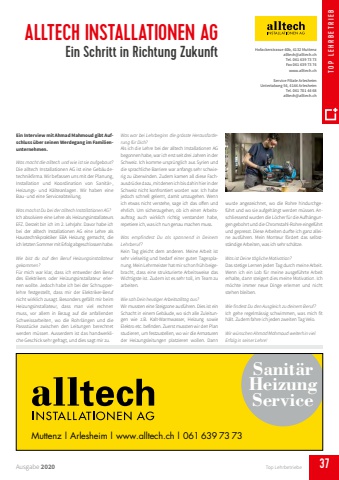 Ausgabe 2020 37 TOP-LEHRBETRIEBELETOP HRBETRIEBEAusgabe 2019 Top Lehrbetriebe 3TOP LEHRBETRIEBALLTECH INSTALLATIONEN AGEin Schritt in Richtung ZukunftEin Interview mit Ahmad Mahmoud gibt Aufschluss %u00fcber seinen Werdegang im Familienunternehmen. Was macht die alltech und wie ist sie aufgebaut?Die alltech Installationen AG ist eine Geb%u00e4udetechnikfirma. Wir befassen uns mit der Planung, Installation und Koordination von Sanit%u00e4r-,Heizungs- und K%u00e4lte anlagen. Wir haben eine Bau- und eine Serviceabteilung. Was machst Du bei der alltech Installationen AG?Ich absolviere eine Lehre als Heizungsinstallateurs EFZ. Derzeit bin ich im 2. Lehrjahr. Davor habe ich bei der alltech Installationen AG eine Lehre als Haustechnikpraktiker EBA Heizung gemacht, die ich letzten Sommer mit Erfolg abgeschlossen habe. Wie bist du auf den Beruf Heizungsinstallateur gekommen?F%u00fcr mich war klar, dass ich entweder den Beruf des Elektrikers oder Heizungsinstallateur erlernen wollte. Jedoch habe ich bei der Schnupperlehre festgestellt, dass mir der Elektriker-Beruf nicht wirklich zusagt. Besonders gef%u00e4llt mir beim Heizungsinstallateur, dass man viel rechnen muss, vor allem in Bezug auf die anfallenden Schweissarbeiten, wo die Rohrl%u00e4ngen und die Passst%u00fccke zwischen den Leitungen berechnet werden m%u00fcssen. Ausserdem ist das handwerkliche Geschick sehr gefragt, und dies sagt mir zu. Was war bei Lehrbeginn die gr%u00f6sste Herausforderung f%u00fcr Dich? Als ich die Lehre bei der alltech Installationen AG begonnen habe, war ich erst seit drei Jahren in der Schweiz. Ich komme urspr%u00fcnglich aus Syrien und die sprachliche Barriere war anfangs sehr schwierig zu %u00fcberwinden. Zudem kamen all diese Fachausdr%u00fccke dazu, mit denen ich bis dahin hier in der Schweiz nicht konfrontiert worden war. Ich habe jedoch schnell gelernt, damit umzugehen. Wenn ich etwas nicht verstehe, sage ich das offen und ehrlich. Um sicherzugehen, ob ich einen Arbeitsauftrag auch wirklich richtig verstanden habe, repetiere ich, was ich nun genau machen muss. Was empfindest Du als spannend in Deinem Lehrberuf?Kein Tag gleicht dem anderen. Meine Arbeit ist sehr vielseitig und bedarf einer guten Tagesplanung. Mein Lehrmeister hat mir schon fr%u00fch beigebracht, dass eine strukturierte Arbeitsweise das Wichtigste ist. Zudem ist es sehr toll, im Team zu arbeiten.Wie sah Dein heutiger Arbeitsalltag aus?Wir mussten eine Steigzone ausf%u00fchren. Dies ist ein Schacht in einem Geb%u00e4ude, wo sich alle Zuleitungen wie z.B. Kalt-Warmwasser, Heizung sowie Elektro etc. befinden. Zuerst mussten wir den Plan studieren, um festzustellen, wo wir die Armaturen der Heizungsleitungen platzieren wollen. Dann wurde angezeichnet, wo die Rohre hindurchgef%u00fchrt und wo sie aufgeh%u00e4ngt werden m%u00fcssen. Anschliessend wurden die L%u00f6cher f%u00fcr die Aufh%u00e4ngungen gebohrt und die Chromstahl-Rohre eingef%u00fchrt und gepresst. Diese Arbeiten durfte ich ganz alleine ausf%u00fchren. Mein Monteur f%u00f6rdert das selbstst%u00e4ndige Arbeiten, was ich sehr sch%u00e4tze. Was ist Deine t%u00e4gliche Motivation?Das stetige Lernen jeden Tag durch meine Arbeit. Wenn ich ein Lob f%u00fcr meine ausgef%u00fchrte Arbeit erhalte, dann steigert dies meine Motivation. Ich m%u00f6chte immer neue Dinge erlernen und nicht stehen bleiben. Wie findest Du den Ausgleich zu deinem Beruf? Ich gehe regelm%u00e4ssig schwimmen, was mich fit h%u00e4lt. Zudem fahre ich jeden zweiten Tag Velo. Wir w%u00fcnschen Ahmad Mahmoud weiterhin viel Erfolg in seiner Lehre!Hofackerstrasse 40b, 4132 Muttenzalltech@alltech.chTel. 061 639 73 73Fax 061 639 73 74www.alltech.chService Filiale ArlesheimUntertalweg 54, 4144 ArlesheimTel. 061 701 44 68alltech@alltech.chLETOP HRBETRIEBEMuttenz | Arlesheim | www.alltech.ch | 061 639 73 73alltech_Baublache_250x150.indd 1 Muttenz | Arlesheim | www.alltech.ch | 061 639 73 73 09.03.16 17:38alltech_Baublache_250x150.indd 1 09.03.16 17:38Sanit%u00e4rHeizungServiceAusgabe 2019 3TOP LEHRBETRIEBALLTECH INSTALLATIONEN AGEin Schritt in Richtung ZukunftEin Interview mit Ahmad Mahmoud gibt Aufschluss %u00fcber seinen Werdegang im Familienunternehmen. Was macht die alltech und wie ist sie aufgebaut?Die alltech Installationen AG ist eine Geb%u00e4udetechnikfirma. Wir befassen uns mit der Planung, Installation und Koordination von Sanit%u00e4r-,Heizungs- und K%u00e4lte anlagen. Wir haben eine Bau- und eine Serviceabteilung. Was machst Du bei der alltech Installationen AG?Ich absolviere eine Lehre als Heizungsinstallateurs EFZ. Derzeit bin ich im 2. Lehrjahr. Davor habe ich bei der alltech Installationen AG eine Lehre als Haustechnikpraktiker EBA Heizung gemacht, die ich letzten Sommer mit Erfolg abgeschlossen habe. Wie bist du auf den Beruf Heizungsinstallateur gekommen?F%u00fcr mich war klar, dass ich entweder den Beruf des Elektrikers oder Heizungsinstallateur erlernen wollte. Jedoch habe ich bei der Schnupperlehre festgestellt, dass mir der Elektriker-Beruf nicht wirklich zusagt. Besonders gef%u00e4llt mir beim Heizungsinstallateur, dass man viel rechnen muss, vor allem in Bezug auf die anfallenden Schweissarbeiten, wo die Rohrl%u00e4ngen und die Passst%u00fccke zwischen den Leitungen berechnet werden m%u00fcssen. Ausserdem ist das handwerkliche Geschick sehr gefragt, und dies sagt mir zu. Was war bei Lehrbeginn die gr%u00f6sste Herausforderung f%u00fcr Dich? Als ich die Lehre bei der alltech Installationen AG begonnen habe, war ich erst seit drei Jahren in der Schweiz. Ich komme urspr%u00fcnglich aus Syrien und die sprachliche Barriere war anfangs sehr schwierig zu %u00fcberwinden. Zudem kamen all diese Fachausdr%u00fccke dazu, mit denen ich bis dahin hier in der Schweiz nicht konfrontiert worden war. Ich habe jedoch schnell gelernt, damit umzugehen. Wenn ich etwas nicht verstehe, sage ich das offen und ehrlich. Um sicherzugehen, ob ich einen Arbeitsauftrag auch wirklich richtig verstanden habe, repetiere ich, was ich nun genau 