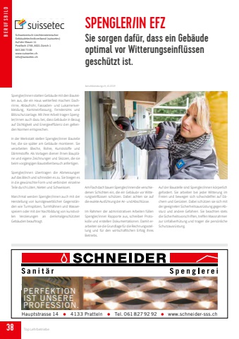 38TOP-LEHRBETRIEBELETOP HRBETRIEBELETOP HRBETRIEBE4 Top Lehrbetriebe BerufsbilderBERUFSBILDSPENGLER/IN EFZSie sorgen daf%u00fcr, dass ein Geb%u00e4udeoptimal vor Witterungseinfl%u00fcssengesch%u00fctzt ist.Spengler/innen statten Geb%u00e4ude mit den Bauteilen aus, die ein Haus wetterfest machen: Dachrinne, Ablaufrohr, Fassaden- und Lukarnenverkleidung, Kamineinfassung, Fenstersims und Blitzschutzanlage. Mit ihrer Arbeit tragen Spengler/innen auch dazu bei, dass Geb%u00e4ude in Bezug auf Dichtigkeit und Energieeffizienz den geltenden Normen entsprechen.In der Werkstatt stellen Spengler/innen Bauteile her, die sie sp%u00e4ter am Geb%u00e4ude montieren. Sie verarbeiten Bleche, Rohre, Kunststoffe und D%u00e4mmstoffe. Als Vorlagen dienen ihnen Baupl%u00e4ne und eigene Zeichnungen und Skizzen, die sie beim vorg%u00e4ngigen Baustellenbesuch anfertigen.Spengler/innen %u00fcbertragen die Abmessungen auf das Blech und schneiden es zu. Sie biegen es in die gew%u00fcnschte Form und verbinden einzelne Teile durch L%u00f6ten, Nieten und Schweissen.Manchmal werden Spengler/innen auch mit der Herstellung von kunstgewerblichen Gegenst%u00e4nden wie Turmspitzen, Turmh%u00e4hnen und Wasserspeiern oder mit der Nachbildung von kunstvollen Verzierungen an denkmalgesch%u00fctzten Geb%u00e4uden beauftragt.Am Flachdach bauen Spengler/innen die verschiedenen Schichten ein, die ein Geb%u00e4ude vor Witterungseinfl%u00fcssen sch%u00fctzen. Dabei achten sie aufdie exakte Ausf%u00fchrung der An- und Abschl%u00fcsse.Im Rahmen der administrativen Arbeiten f%u00fcllen Spengler/innen Rapporte aus, schreiben Protokolle und erstellen Dokumentationen. Damit erarbeiten sie die Grundlage f%u00fcr die Rechnungsstellung und f%u00fcr den wirtschaftlichen Erfolg ihres Betriebs.Auf der Baustelle sind Spengler/innen k%u00f6rperlich gefordert. Sie arbeiten bei jeder Witterung im Freien und bewegen sich schwindelfrei auf D%u00e4chern und Ger%u00fcsten. Dabei sch%u00fctzen sie sich mit der geeigneten Sicherheitsausr%u00fcstung gegen Absturz und andere Gefahren. Sie beachten stets die Sicherheitsvorschriften, treffen Massnahmen zur Unfallverh%u00fctung und tragen die pers%u00f6nliche Schutzausr%u00fcstung.Schweizerisch-LiechtensteinischerGeb%u00e4udetechnikverband (suissetec)Auf der Mauer 11Postfach 1768, 8021 Z%u00fcrich 1043 244 73 00www.suissetec.chinfo@suissetec.chberufsberatung.ch, %u00a9 2019PERFEKTION IST UNSERE PROFESSION.Hauptstrasse 14 4133 Pratteln Tel. 061 827 92 92 www.schneider-sss.ch