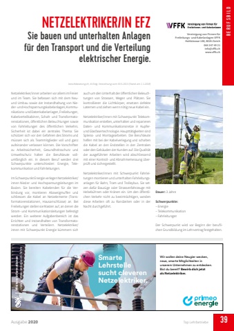 Ausgabe 2020 39 BERUFSBILDTop Lehrbetriebe Berufsbilder 3BERUFSBILDAusgabe 2019NETZELEKTRIKER/IN EFZSie bauen und unterhalten Anlagenf%u00fcr den Transport und die Verteilung elektrischer Energie.Netzelektriker/innen arbeiten vor allem im Freien und im Team. Sie befassen sich mit dem Neuund Umbau sowie der Instandhaltung von Nieder- und Hochspannungskabelanlagen, Kommunikations- und Datenkabelanlagen, Freileitungen, Kabelverteilkabinen, Schalt- und Transformatorenstationen, %u00f6ffentlichen Beleuchtungen sowie von Fahrleitungen des %u00f6ffentlichen Verkehrs.Sicherheit ist dabei ein zentrales Thema: Sie sch%u00fctzen sich vor den Gefahren des Stroms und m%u00fcssen sich als Teammitglieder voll und ganz aufeinander verlassen k%u00f6nnen. Die Vorschriften zu Arbeitssicherheit, Gesundheitsschutz und Umweltschutz halten die Berufsleute vollumf%u00e4nglich ein. In diesem Beruf werden drei Schwerpunkte unterschieden: Energie, Telekommunikation und Fahrleitungen.Im Schwerpunkt Energie verlegen Netzelektriker/innen Nieder- und Hochspannungsleitungen im Boden. Sie bereiten Kabelenden f%u00fcr die Verbindung vor, montieren Abzweigmuffen und schliessen die Kabel an Netzelemente (Transformatorenstationen, Hausanschl%u00fcsse) an. Bei Freileitungen stellen sie Masten auf, an denen die Strom- und Kommunikationsleitungen befestigt werden. Ein weiterer Aufgabenbereich ist dasErrichten und Instandhalten von Transformatorenstationen und Verteilern. Netzelektriker/innen mit Schwerpunkt Energie k%u00fcmmern sich auch um den Unterhalt der %u00f6ffentlichen Beleuchtungen von Strassen, Wegen und Pl%u00e4tzen. Sie kontrollieren die Lichtk%u00f6rper, ersetzen defekte Laternen und ziehen wenn n%u00f6tig neue Kabel ein.Netzelektriker/innen mit Schwerpunkt Telekommunikation erstellen, unterhalten und reparieren Daten- und Kommunikationsnetze in Kupferund Glasfasertechnologie. Hauptt%u00e4tigkeiten sind Spleiss- und Montagearbeiten. Die Berufsleute helfen mit bei der Kabelverlegung und schalten die Kabel an den Endstellen in den Zentralen oder den Geb%u00e4uden der Kunden auf. Die Qualit%u00e4t der ausgef%u00fchrten Arbeiten wird abschliessend mit einer Kontroll- und Abnahmemessung %u00fcberpr%u00fcft und sichergestellt.Netzelektriker/innen mit Schwerpunkt Fahrleitungen montieren und unterhalten Fahrleitungsanlagen f%u00fcr Bahn, Tram und Trolleybus. Sie setzen daf%u00fcr Bauz%u00fcge oder Strassenfahrzeuge mit Hebeb%u00fchnen oder Kr%u00e4nen ein. Um den %u00f6ffentlichen Verkehr nicht zu beeintr%u00e4chtigen, werden diese Arbeiten oft zu Randzeiten oder in der Nacht durchgef%u00fchrt.Dauer: 3 JahreSchwerpunkte:%u2013 Energie%u2013 Telekommunikation%u2013 FahrleitungenDer Schwerpunkt wird vor Beginn der beruflichen Grundbildung im Lehrvertrag festge halten.Vereinigung von Firmen f%u00fcrFreileitungs- und Kabelanlagen VFFKHohlstrasse 188, 8026 Z%u00fcrich044 247 49 21info@vff k.chwww.vff k.chberufsberatung.ch, %u00a9 Eidg. Verordnung vom 30.5.2013 (Stand am 1.1.2018)Smarte Lehrstellesucht cleverenNetzelektriker.Wir wollen deine Neugier wecken, neue, smarte M%u00f6glichkeiten in unserem Unternehmen zu entdecken. Bist du bereit? Bewirb dich jetzt als Netzelektriker. Weitere Informationen www.primeo-energie.ch/lehre