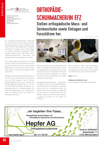 40BERUFSBILDAusgabeTop Lehrbetriebe 2018 Berufsbilder 3BERUFSBILDORTHOP%u00c4DIESCHUHMACHER/IN EFZStellen orthop%u00e4dische Mass- undSerienschuhe sowie Einlagen undFussst%u00fctzen her.Mit orthop%u00e4dieschuhtechnischen Hilfsmitteln und Produkten kann die Fussstellung oder K%u00f6rperhaltung korrigiert werden. So k%u00f6nnen Menschen mit den unterschiedlichsten Problemen schmerzfrei und bequem gehen. Sie ben%u00f6tigen zum Beispiel individuell angefertigte Schuheinlagen, spezielle Schuhe oder St%u00fctzen. Orthop%u00e4dieschuhmacher/innen beherrschen das Handwerk f%u00fcr die Herstellung dieser Produkte.Bevor Orthop%u00e4dieschuhmacher/innen Auftr%u00e4ge ausf%u00fchren, kl%u00e4ren sie die Bed%u00fcrfnisse ihrer Kunden ab und beraten sie %u00fcber die verschiedenen M%u00f6glichkeiten sowie die Kosten. Dabei wenden sie ihr Wissen in Anatomie, Pathologie und Biomechanik an.Beklagen sich Kundinnen %u00fcber Beschwerden, die von den F%u00fcssen oder den Beinen, von den Knien oder der H%u00fcfte ausgehen, suchen Orthop%u00e4dieschuhmacher/innen nach den Ursachen und schlagen geeignete Massnahmen vor. Das k%u00f6nnen zum Beispiel Abrollhilfen, D%u00e4mpfungs- und Stellungskorrekturen, Schaftpolsterungen oder Beinverk%u00fcrzungsausgleiche sein. Sie berechnen exakt, wie jemand auftritt, und erstellen anschliessend eine Skizze.F%u00fcr Kunden, die keine Serienschuhe tragen k%u00f6nnen, stellen Orthop%u00e4dieschuhmacher/innen anhand von vorgegebenen Daten Massschuhe her. Dazu machen sie zuerst ein Gipsnegativ des Fusses, das sie mit Hartschaum ausgiessen. So entsteht ein Leisten, der f%u00fcr das Anfertigen von Fussbett und Boden die Basis bildet.Orthop%u00e4dieschuhmacher/innen %u00fcbernehmen auch Boden-, Schaft- und orthop%u00e4dieschuhtechnische Reparaturen an Konfektions- und Spezialschuhen sowie an orthop%u00e4dischen Mass- und Serienschuhen. Dabei verarbeiten sie Materialien wie Leder, Gummi, Kunststoffe, Klebstoffe, Chemikalien, Textilien und Kork. Mit diesen Materialien gehen sie sparsam um und lagern sie fachgerecht.Bei der t%u00e4glichen Arbeit halten Orthop%u00e4dieschuhmacher/innen ihren Arbeitsplatz sauber und beachten die Vorschriften zu Umweltschutz, Gesundheitsschutz und zur Arbeitssicherheit.Dauer: 4 JahreBildung in beruflicher Praxis:In einem Atelier f%u00fcr Orthop%u00e4die-SchuhtechnikVerband Fuss & SchuhTribschenstr. 7Postfach 3065, 6002 Luzern041 368 58 09info@f-u-s.chwww.fussundschuh.chberufsberatung.ch, %u00a9 2018