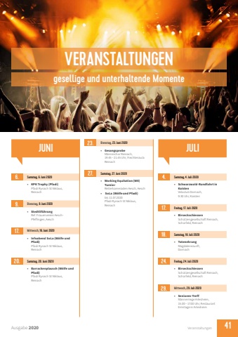 VERANSTALTUNGENgesellige und unterhaltende MomenteAusgabe 2020 Veranstaltungen 416. Samstag, 6. Juni 2020%u2022 KPK Trophy (Pfadi)Pfadi Rynach St Niklaus, Reinach9. Dienstag, 9. Juni 2020%u2022 Stedtlif%u00fchrungRef. Frauenverein AeschPfeffingen, Aesch17. Mittwoch, 16. Juni 2020%u2022 Infoabend SoLa (W%u00f6lfe und Pfadi)Pfadi Rynach St Niklaus, Reinach20. Samstag, 20. Juni 2020%u2022 Barrackenplausch (W%u00f6lfe und Pfadi)Pfadi Rynach St Niklaus, ReinachJUNI 23. Dienstag, 23. Juni 2020%u2022 GesangsprobeM%u00e4nnerchor Reinach, 19.45 %u2013 21.45 Uhr, Fiechtenaula Reinach27. Samstag, 27. Juni 2020%u2022 Working Equitation (WE) TurnierReiterkameraden Aesch, Aesch%u2022 SoLa (W%u00f6lfe und Pfadi) bis 11.07.2020Pfadi Rynach St Niklaus, Reinach4. Samstag, 4. Juli 2020%u2022 Schwarzwald-Rundfahrt in KaistenVeloclub Dornach, 9.30 Uhr, Kaisten17. Freitag, 17. Juli 2020%u2022 BirseckschiessenSch%u00fctzengesellschaft Reinach, Sch%u00fcrfeld, Reinach18. Samstag, 18. Juli 2020%u2022 TotenehrungMagdalenezunft, Dornach24. Freitag, 24. Juli 2020%u2022 BirseckschiessenSch%u00fctzengesellschaft Reinach, Sch%u00fcrfeld, Reinach29. Mittwoch, 29. Juli 2020%u2022 Senioren-TreffM%u00e4nnerriege Arlesheim,15.00 %u2013 17.00 Uhr, Restaurant Ermitage in Arlesheim JULI