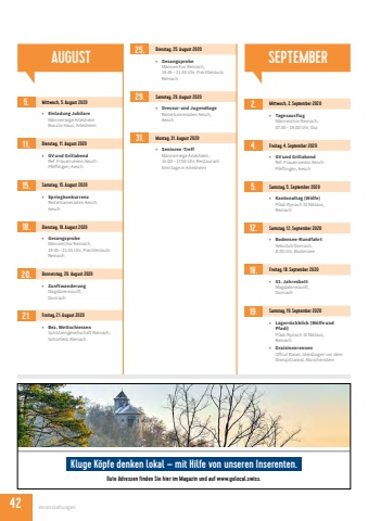 42 Veranstaltungen25. Dienstag, 25. August 2020%u2022 GesangsprobeM%u00e4nnerchor Reinach, 19.45 %u2013 21.45 Uhr, Fiechtenaula Reinach29. Samstag, 29. August 2020%u2022 Dressur-und JugendtageReiterkameraden Aesch, Aesch31. Montag, 31. August 2020%u2022 Senioren-TreffM%u00e4nnerriege Arlesheim, 15.00 %u2013 17.00 Uhr, Restaurant Ermitage in Arlesheim5. Mittwoch, 5. August 2020%u2022 Einladung JubilareM%u00e4nnerriege ArlesheimBoccia-Haus, Arlesheim11. Dienstag, 11. August 2020%u2022 GV und GrillabendRef. Frauenverein AeschPfeffingen, Aesch15. Samstag, 15. August 2020%u2022 SpringkonkurrenzReiterkameraden Aesch, Aesch18. Dienstag, 18. August 2020%u2022 GesangsprobeM%u00e4nnerchor Reinach, 19.45 %u2013 21.45 Uhr, Fiechtenaula Reinach20. Donnerstag, 20. August 2020%u2022 ZunftwanderungMagdalenezunft, Dornach21. Freitag, 21. August 2020%u2022 Bez. WettschiessenSch%u00fctzengesellschaft Reinach, Sch%u00fcrfeld, ReinachAUGUST%u20222. Mittwoch, 2. September 2020%u2022 TagesausflugM%u00e4nnerchor Reinach, 07.30 %u2013 19.00 Uhr, tba4. Freitag, 4. September 2020%u2022 GV und GrillabendRef. Frauenverein AeschPfeffingen, Aesch5. Samstag, 5. September 2020%u2022 Kantonaltag (W%u00f6lfe)Pfadi Rynach St Niklaus, Reinach12. Samstag, 12. September 2020%u2022 Bodensee-RundfahrtVeloclub Dornach, 8.30 Uhr, Bodensee18. Freitag, 18. September 2020%u2022 53. JahresbottMagdalenezunft,Dornach19. Samstag, 19. September 2020%u2022 Lagerr%u00fcckblick (W%u00f6lfe und Pfadi)Pfadi Rynach St Niklaus, Reinach%u2022 DraisinenrennenOffcut Basel, Gleisbogen vor dem Dreispitzareal, M%u00fcnchensteinSEPTEMBERKluge K%u00f6pfe denken lokal %u2013 mit Hilfe von unseren Inserenten.Gute Adressen finden Sie hier im Magazin und auf www.golocal.swiss.