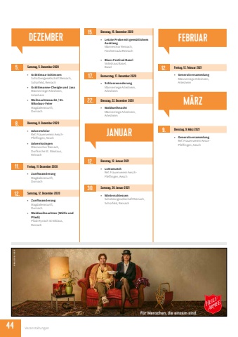 44 Veranstaltungen%u20225. Samstag, 5. Dezember 2020%u2022 Gr%u00e4ttimaa-SchiessenSch%u00fctzengesellschaft Reinach, Sch%u00fcrfeld, Reinach%u2022 Gr%u00e4ttimanne-Cheigle und JassM%u00e4nnerriege Arlesheim, Arlesheim%u2022 Weihnachtsmarkt / St. Nikolaus-FeierMagdalenezunft, Dornach8. Dienstag, 8. Dezember 2020%u2022 AdventsfeierRef. Frauenverein AeschPfeffingen, Aesch%u2022 AdventssingenM%u00e4nnerchor Reinach, Dorfkirche St. Nikolaus, Reinach11. Freitag, 11. Dezember 2020%u2022 ZunftwanderungMagdalenezunft, Dornach12. Samstag, 12. Dezember 2020%u2022 ZunftwanderungMagdalenezunft, Dornach%u2022 Waldweihnachten (W%u00f6lfe und Pfadi)Pfadi Rynach St Niklaus, ReinachDEZEMBER 15. Dienstag, 15. Dezember 2020%u2022 Letzte Probe mit gem%u00fctlichem AusklangM%u00e4nnerchor Reinach, Fiechtenaula Reinach%u2022 Blues Festival Basel Volkshaus Basel, Basel17. Donnerstag, 17. Dezember 2020%u2022 SchlusswanderungM%u00e4nnerriege Arlesheim,Arlesheim22. Dienstag, 22. Dezember 2020%u2022 WaldweihnachtM%u00e4nnerriege Arlesheim,Arlesheim12. Dienstag, 12. Januar 2021%u2022 LottomatchRef. Frauenverein AeschPfeffingen, Aesch30. Samstag, 30. Januar 2021%u2022 WinterschiessenSch%u00fctzengesellschaft Reinach, Sch%u00fcrfeld, ReinachJANUAR%u202212. Freitag, 12. Februar 2021%u2022 GeneralversammlungM%u00e4nnerriege Arlesheim,Arlesheim%u20229. Dienstag, 9. M%u00e4rz 2021%u2022 GeneralversammlungRef. Frauenverein AeschPfeffingen, AeschFEBRUARM%u00c4RZF%u00fcr Menschen, die einsam sind.SPINAS CIVIL VOICES