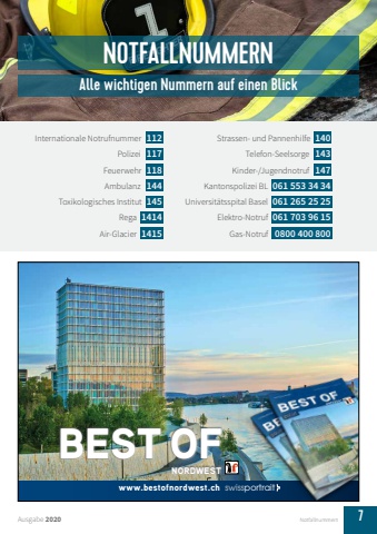 Ausgabe 2020 Notfallnummern 7NOTFALLNUMMERNAlle wichtigen Nummern auf einen BlickStrassen- und Pannenhilfe 140Telefon-Seelsorge 143Kinder-/Jugendnotruf 147Kantonspolizei BL 061 553 34 34Universit%u00e4tsspital Basel 061 265 25 25 Elektro-Notruf 061 703 96 15 Gas-Notruf 0800 400 800Internationale Notrufnummer 112Polizei 117Feuerwehr 118Ambulanz 144Toxikologisches Institut 145Rega 1414Air-Glacier 1415BEST OFNORDWESTwww.bestofnordwest.ch swissportrait