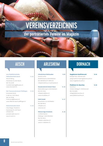 8 Vereinsverzeichnis VEREINSVERZEICHNISder portr%u00e4tierten Vereine im Magazinmsa Modelleisenbahn Sekundarschule Aesch S. 12Marcel H%u00e4ringFluhstrasse 13, 4147 Aesch061 751 52 69marcello.haering@bluewin.chwww.msa-aesch.chRef. Frauenverein Aesch-Pfeffingen S. 13 Annamarie Horat In der Au 2, 4147 Aesch061 751 29 48horat.anne@bluewin.ch www.refkirche-aesch-pfeffingen.chReiterkameraden Aesch S. 14Gaby Wenger, Pr%u00e4sidentinBaselstrasse 55, 4147 Aesch079 650 70 28praesidium@rk-aesch.chwww.rk-aesch.chAESCHMagdalenen-Zunft Dornach S. 21Postfach 301, 4143 Dornachjuerg.huerlimann@magdalenenzunft.chwww.magdalenenzunft.chPfadfinder St. Mauritius S. 22Lena KunzUnterer Zielweg 17, 4143 Dornach061 701 66 86info@pfadistmauritius.chwww.pfadistmauritius.chDORNACHChinderhuus M%u00e4rlizauber S.19Sandra LocherBaselstrasse 54, 4144 Arlesheim061 599 89 00, 077 439 01 81info@chinderhuus-maerlizauber.chDemokratische Schule Fokus S. 16Malsmattenweg 3, 4144 Arlesheim 061 421 44 64info@schulefokus.chwww.schulefokus.chESVO GmbH S. 17Rauacherstr. 24, 4125 Riehen061 481 09 53info@esvo.chwww.esvo.chM%u00e4nnerriege Arlesheim S. 18c/o Ren%u00e9 Danner Mattweg 7, 4144 Arlesheim061 701 26 41info@mr-arlesheim.chwww.mr-arlesheim.chARLESHEIM