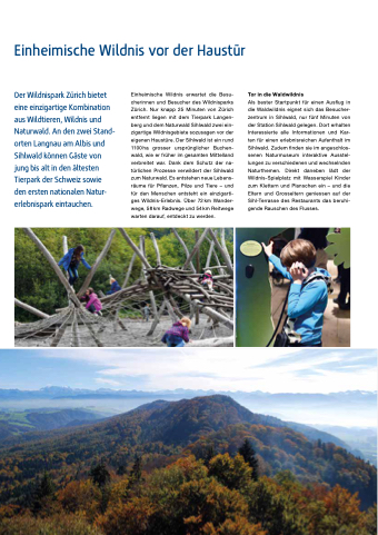 Der Wildnispark Zürich bietet eine einzigartige Kombination aus Wildtieren, Wildnis und Naturwald. An den zwei Stand- orten Langnau am Albis und Sihlwald können Gäste von jung bis alt in den ältesten Tierpark der Schweiz sowie den ersten nationalen Natur- erlebnispark eintauchen.