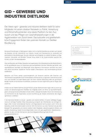 Der Verein «gid – gewerbe und industrie dietlikon» stellt für seine Mitglieder mit einem direkten Netzwerk zu Politik, Verwaltung und Wirtschaftsverbänden eine ideale Plattform für den Aus- tausch und das Pflegen von Geschäftsbeziehungen in der Agglomeration von Zürich bereit. Das kulturelle und gesellschaft- liche Engagement fördert den positiven Kontakt zur Dietliker Bevölkerung.