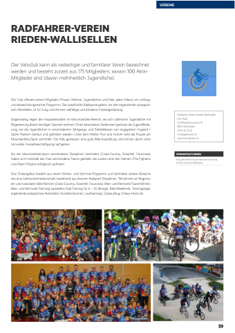 Gegenwärtig liegen die Hauptaktivitäten im Mountainbike-Bereich, wo sich zahlreiche Jugendliche mit Begeisterung dieser trendigen Sportart widmen. Einen besonderen Stellenwert geniesst die Jugendförde- rung, wo die Jugendlichen in verschiedenen Jahrgangs- und Stärkeklassen von engagierten «Jugend + Sport»-Trainern betreut und gefördert werden. Unter dem Motto «Fun and Action» wird die Freude am Mountainbike-Sport vermittelt. Die Kids geniessen eine gute Bike-Ausbildung und können damit einer sinnvollen Freizeitbeschäftigung nachgehen.
