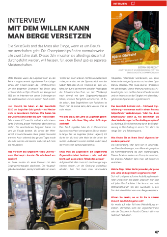 Herr Obrecht, Sie haben an den SwissSkills 2020 der Logistiker Gold geholt – ein Wettbe- werb in besonderem Rahmen. Wie haben Sie die Qualifikationsrunden bis zum Finale erlebt? Sehr spannend! Es war für mich eine sehr interes- sante Erfahrung, diesen Wettkampf absolvieren zu dürfen. Die verschiedenen Aufgaben haben mir sehr viel Freude bereitet. Ich konnte den Wett- kampf erstaunlicherweise ohne grosse Nervosität antreten. Auch während des ganzen Tages wurde ich nicht nervös und konnte mich voll auf mein Ziel fokussieren.