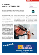 zum Beispiel bestehende Anlagen umbauen, besprechen sie verschiedene Lösungen und planen gemeinsam die Ausführung, um den Betriebsunterbruch möglichst kurz zu halten. Im Service- und Reparaturdienst erklären sie der Kundschaft die Bedienung der Installatio- nen und Geräte. Das Arbeitsgebiet von Elektro- installateuren EFZ ist abwechslungsreich: Sie wechseln häufig den Arbeitsort und arbeiten viel selbstständig, teils alleine, teils im Team.