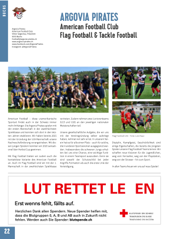 American Football – diese uramerikanische Sportart findet auch in der Schweiz immer mehr Anhänger. Die Argovia Pirates spielen mit der ersten Mannschaft in der zweithöchsten Spielklasse und konnten sich dort in den letz- ten Jahren etablieren. Wir haben bereits 2015 mit der Gründung der U19 Mannschaft unsere Nachwuchsförderung vorangetrieben. Mit die- sen jungen Spielern konnten wir 2020 sensati- onell den Herbst Cup gewinnen.