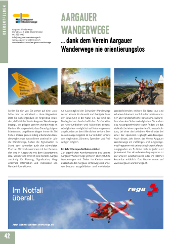 Stellen Sie sich vor: Sie stehen auf einer Jura- höhe oder im Mittelland – ohne Wegweiser! Dass Sie nicht irgendwo im Nirgendwo stran- den; dafür ist der Verein Aargauer Wanderwege besorgt. Wir pflegen 1650km Wanderwege im Kanton. Wir sorgen dafür, dass Sie auf gut signa- lisierten und begehbaren Wegen immer Ihr Ziel finden. Unsere gemeinnützig arbeitenden Wan- derwegbetreuer kontrollieren zweimal im Jahr die Wanderwege, halten die Signalisation in Stand oder schneiden auch den schmalsten Pfad frei. Wir sind zusammen mit den Gemein- den und in Absprache mit dem Departement Bau, Verkehr und Umwelt des Kantons Aargau zuständig für Planung, Signalisation, Weg- unterhalt, Information und Publikation von Wanderinformationen.