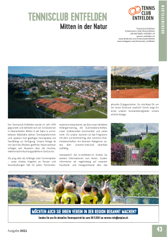 Tennisclub Entfelden Schützenrain, 5036 Oberentfelden sekretariat@tc-entfelden.ch www.tc-entfelden.ch www.facebook.com/TennisclubEntfelden www.instagram.com/tennisclub_entfelden