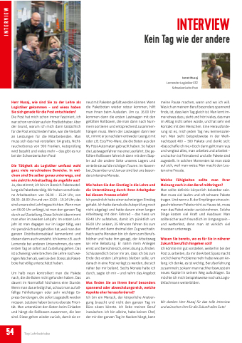 Die Tätigkeit als Logistiker umfasst wohl ganz viele verschiedene Bereiche. In wel- chem sind Sie selber genau unterwegs, und wie sieht Ihr Arbeitsalltag da ungefähr aus? Ja, das stimmt; ich bin im Bereich Paketzustel- lung als Paketbote tätig. Wir haben verschiede- ne Arbeitszeiten: von 06.00 – 15.24 Uhr, von 08.30 –18.00 Uhr und von 10.00 – 19.24 Uhr; das sind unsere drei Lehrlingsschichten. Wenn man um 06.00 Uhr anfängt, ist man den ganzen Tag durch auf Zustellung. Diese Schicht übernimmt man eher im zweiten Lehrjahr. Im ersten Lehr- jahr ist man dagegen nur im Lager tätig, was mir persönlich sehr geholfen hat, weil man den ganzen Distributionsablauf kennenlernt und diesen dann auch versteht. Ich kenne z.B. auch Lernende bei anderen Unternehmen, die vom ersten Tag an sofort auf Zustellung gehen. Das ist schwierig; viele brechen die Lehre nach we- nigen Wochen ab, weil sie den Stress als Paket- bote hat völlig unterschätzt haben.
