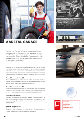 Die Aaretal Garage AG bildet seit vielen Jahren erfolgreich Berufsleute aus. Ein Beruf im Autoge- werbe bietet Ihnen eine Zukunftsperspektive mit interessanten und attraktiven Entwicklungs- und Aufstiegsmöglichkeiten.