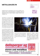 Metallbauer/innen der Fachrichtung Stahlbau arbeiten in grossen Montagehallen und fertigen Tragkonstruktionen für Hallen, Brücken oder Lifte. Bei den Schmiedearbeiten kommen neben den Verarbeitungstechniken des Metall- und Stahl- baus Hammer und Amboss zum Einsatz. Das Schmiedeeisen wird in der Esse zum Glühen gebracht und anschliessend von Hand oder mit dem Dampfhammer geschmiedet. Metallbauer/ innen arbeiten vor allem mit Stahl und Aluminium, daneben verwenden sie aber auch Metalle wie Chromnickelstahl, Messing, Baubronze oder Kup- fer sowie Kunststoffe, Isoliermaterialien und Glas.
