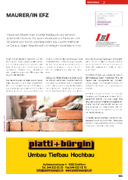 Maurer sind auf Baustellen des Hoch- und Tief- baus tätig. Im Hochbau werden vor allem Gebäu- de erstellt: Wohnhäuser, Einkaufszentren, Schulan- lagen oder Industriebauten. Zum Tiefbau gehören Tunnelbauten, Brücken, Kanalisationssysteme oder Infrastrukturbauten wie Kläranlagen, das Strassen- oder Bahnnetz.