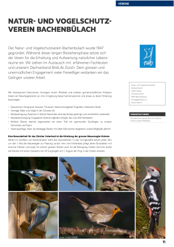 Der Natur- und Vogelschutzverein Bachenbülach wurde 1947 gegründet. Während dieser langen Bestehensphase setzte sich der Verein für die Erhaltung und Aufwertung natürlicher Lebens- räume ein. Wir stehen im Austausch mit erfahrenen Fachleuten und unserem Dachverband BirdLife Zürich. Dem grossen und unermüdlichen Engagement vieler Freiwilliger verdanken wir das Gelingen unserer Arbeit.