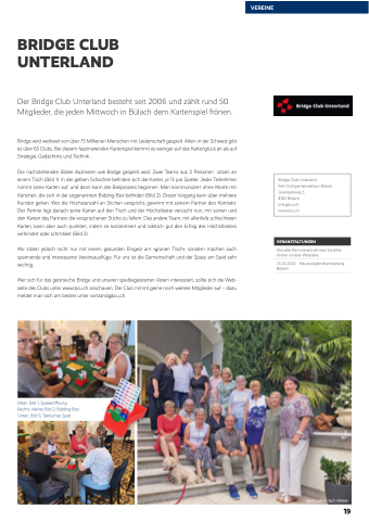 Wer sich für das geistreiche Bridge und unseren spielbegeisterten Verein interessiert, sollte sich die Web- seite des Clubs unter www.bcu.ch anschauen. Der Club nimmt gerne noch weitere Mitglieder auf – dazu meldet man sich am besten unter vorstand@bcu.ch.