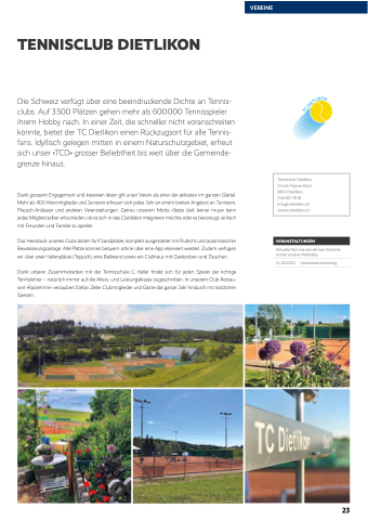 Die Schweiz verfügt über eine beeindruckende Dichte an Tennis- clubs. Auf 3 500 Plätzen gehen mehr als 600 000 Tennisspieler ihrem Hobby nach. In einer Zeit, die schneller nicht voranschreiten könnte, bietet der TC Dietlikon einen Rückzugsort für alle Tennis- fans. Idyllisch gelegen mitten in einem Naturschutzgebiet, erfreut sich unser «TCD» grosser Beliebtheit bis weit über die Gemeinde- grenze hinaus.