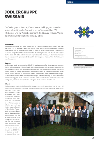 geschrieben. Die Hoff- nung ist gross, dass sich noch einiges davon reali- sieren lässt. Der Vorstand ist der Meinung, dass es einfacher ist, Events zu streichen als unvorbereitet auf dem falschen Fuss er- wischt zu werden. Daher wird der Gruppe die Arbeit nicht ausgehen. Als Teil der Kultur in Kloten ist es wichtig, auch dafür zu sor- gen, dass sich Menschen dafür interessieren und sich anschliessen. Die Pro- ben finden jeweils am Mittwoch ab 20.00 Uhr im Dorfnest, an der Gru- benstrasse in Kloten statt.