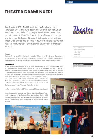 Das Theater DRAMI NÜERI setzt sich aus Mitgliedern von Nürensdorf und Umgebung zusammen und hat sich dem unter- haltsamen, humorvollen Theaterspiel verschrieben. Unser Spekt- rum reicht von der Komödie über Boulevard-Theater zu Lustspiel und Schwank. Die Proben für unser Stück beginnen im Mai und finden unter professioneller Regie in freundschaftlicher Teamarbeit statt. Die Aufführungen können Sie wie gewohnt im November besuchen.