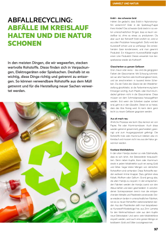 Ähnliche Prozesse wie beim Glas kennen wir von Papier, Pet oder Aluminiumdosen. Auch diese werden getrennt gesammelt, geschreddert, gerei- nigt und zum Ausgangsprodukt gefertigt. Die Rohstoffe Holz oder Aluminium bleiben also im Kreislauf und müssen nicht neu aus der Natur ge- wonnen werden.