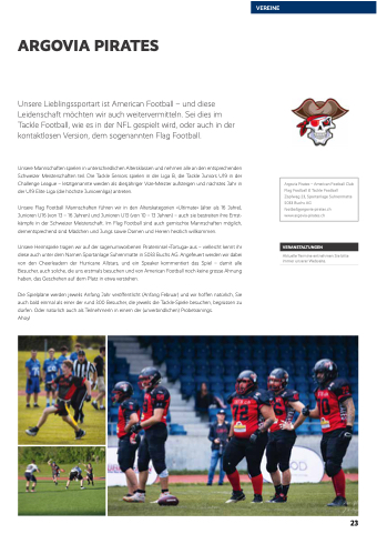 Argovia Pirates – American Football Club Flag Football & Tackle Football Zopfweg 23, Sportanlage Suhrenmatte 5033 Buchs AG football@argovia-pirates.ch www.argovia-pirates.ch