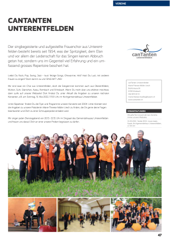 Wir sind zwar ein Chor aus Unterentfelden, doch die Sängerinnen kommen auch aus Oberentfelden, Muhen, Suhr, Gränichen, Aarau, Rombach und Erlinsbach. Wenn Du mehr über uns erfahren möchtest, dann surfe auf unserer Webseite! Dort findest Du unter Aktuell die Angaben zu unseren nächsten Konzerten, z.B. am Sonntag, 15. Mai 2022, 17.00 Uhr, im Kirchgemeindehaus Unterentfelden.