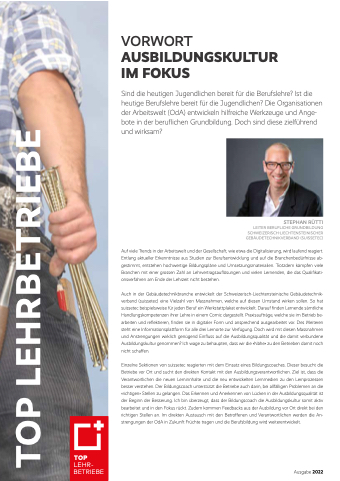 Auch in der Gebäudetechnikbranche entwickelt der Schweizerisch-Liechtensteinische Gebäudetechnik- verband (suissetec) eine Vielzahl von Massnahmen, welche auf diesen Umstand wirken sollen. So hat suissetec beispielsweise für jeden Beruf ein Werkstattplakat entwickelt. Darauf finden Lernende sämtliche Handlungskompetenzen ihrer Lehre in einem Comic dargestellt. Praxisaufträge, welche sie im Betrieb be- arbeiten und reflektieren, finden sie in digitaler Form und ansprechend ausgearbeitet vor. Des Weiteren steht eine Informationsplattform für alle drei Lernorte zur Verfügung. Doch wird mit diesen Massnahmen und Anstrengungen wirklich genügend Einfluss auf die Ausbildungsqualität und die damit verbundene Ausbildungskultur genommen? Ich wage zu behaupten, dass wir die «Nähe» zu den Betrieben damit noch nicht schaffen.
