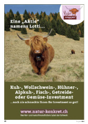 Eine „Aktie“ namens Lotti... ® Kuh-, Wollschwein-, Hühner-, Alpkuh-, Fisch-, Getreide- oder Gemüse-Investment ...noch nie schmeckte Ihnen Ihr Investment so gut! www.natur-konkret.ch Das tier- und naturfreundlichste Label der Schweiz 22 Ausgabe 2022
