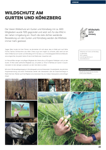 Der Verein Wildschutz am Gurten und Könizberg mit ca. 600 Mitgliedern wurde 1935 gegründet und setzt sich für das Wild in der nahen Umgebung ein. Durch die stets dichter werdende Besiedelung um den Gurten und Könizberg werden die Wildtiere immer mehr gestresst.