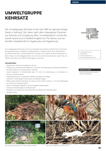 Die Umweltgruppe Kehrsatz ist seit April 1987 ein gemeinnütziger Verein in Kehrsatz. Der Verein steht allen interessierten Personen aus Kehrsatz und Umgebung offen, ist parteipolitisch und konfes- sionell neutral und ist Kollektivmitglied von Pro Natura und von Ala Bern (Gesellschaft für Vogelkunde und Vogelschutz).