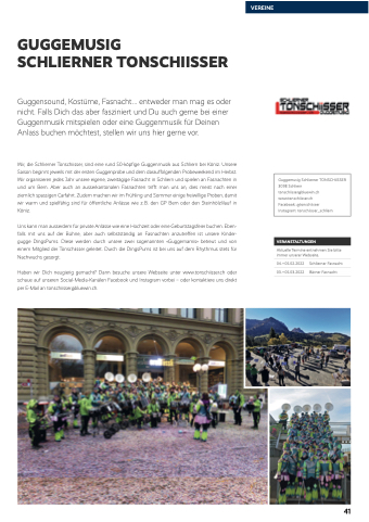 Uns kann man ausserdem für private Anlässe wie eine Hochzeit oder eine Geburtstagsfeier buchen. Eben- falls mit uns auf der Bühne, aber auch selbstständig an Fasnachten anzutreffen ist unsere Kinder- gugge DingsPums. Diese werden durch unsere zwei sogenannten «Guggemamis» betreut und von einem Mitglied der Tonschiisser geleitet. Durch die DingsPums ist bei uns auf dem Rhythmus stets für Nachwuchs gesorgt.