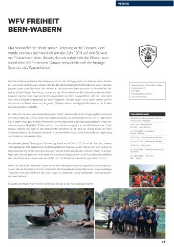 Der Wasserfahrverein Freiheit Bern-Wabern wurde im Jahr 1932 gegründet und befindet sich in Wabern bei Bern an der schönen Aare. Etwas unterhalb des Campingplatzes Eichholz haben wir unser Trainings- gelände sowie unser Bootshaus. Wir nehmen an den Nationalen Meisterschaften im Wasserfahren teil, welche auf den Flüssen Aare, Reuss, Limmat und dem Rhein stattfinden. Wir unterscheiden bei den Wett- kämpfen zwischen dem sogenannten Einzelwettfahren und dem Paarwettfahren. Alle drei Jahre steht dann eine Schweizermeisterschaft auf dem Programm. Nächste Saison ist es wieder soweit und wir messen uns mit Wasserfahrern aus der ganzen Schweiz in einem zweitägigen Wettfahren an der Schwei- zermeisterschaft in Birsfelden.
