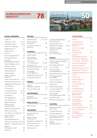 Elektro AG 12 Gerber B+S Küchen AG 4, 38 Gloor Gebäudetechnik AG 103 Guggisberg Dachtechnik AG 90 H. R. Probst AG 44 H. Zürcher AG 60 HJ. Aeschbacher AG 32, 56 Immo Profis GmbH 34, 57 Intertapis AG 92 Jost Spenglerei AG 98 Leu Haustech AG U2, 55 Malerei Hodler AG 93 Mächler Sanitär